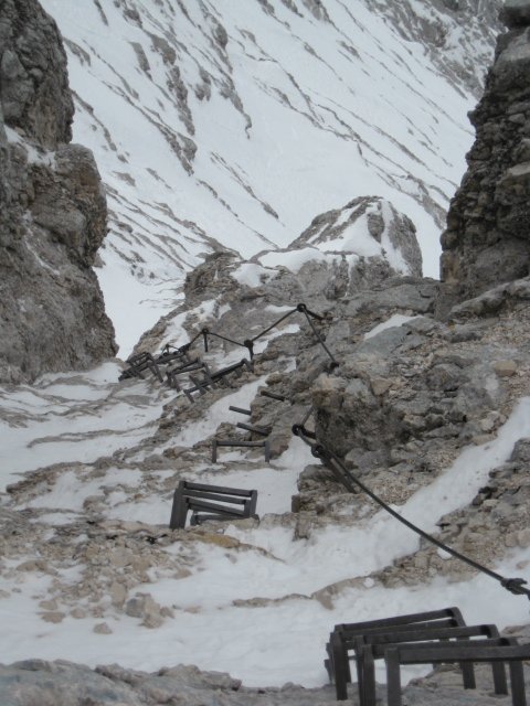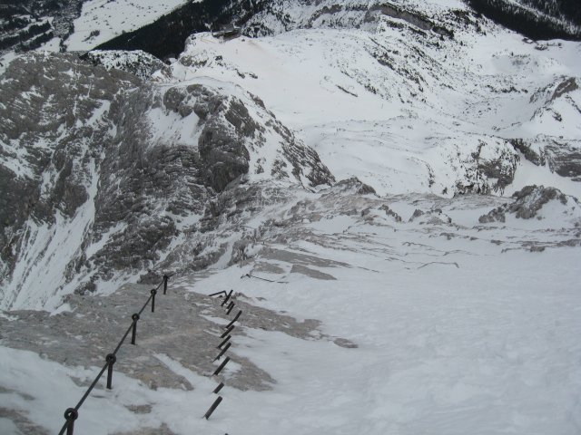 Alternativ und aber sehr langwierig kann man auch über den Matheiskarsteig (B/C) ins Höllental zur Höllentalanger Hütte absteigen und durch die Hölltelklamm ins Tal (4 Std.).