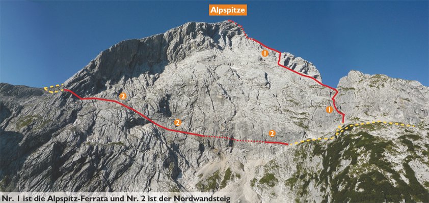 Von der Bergstation der Alpspitzbahn auf dem Osterfelderkopf folgt man der Beschilderung Alpspitz-Ferrata/Nordwandsteig. Der Steig quert unter Felswänden, bis man kurz vor dem Nordwandsteig (Wegweiser) rechts zum Einstieg der Alpspitz-Ferrata abzweigt.