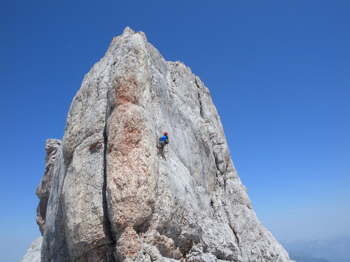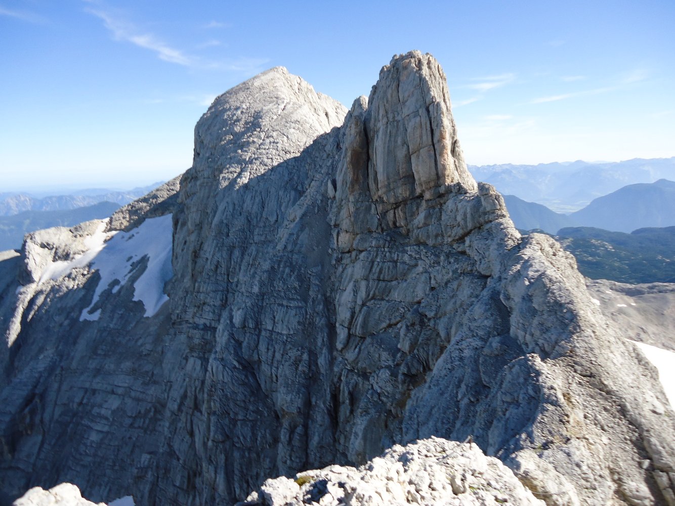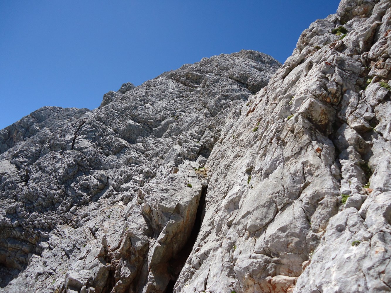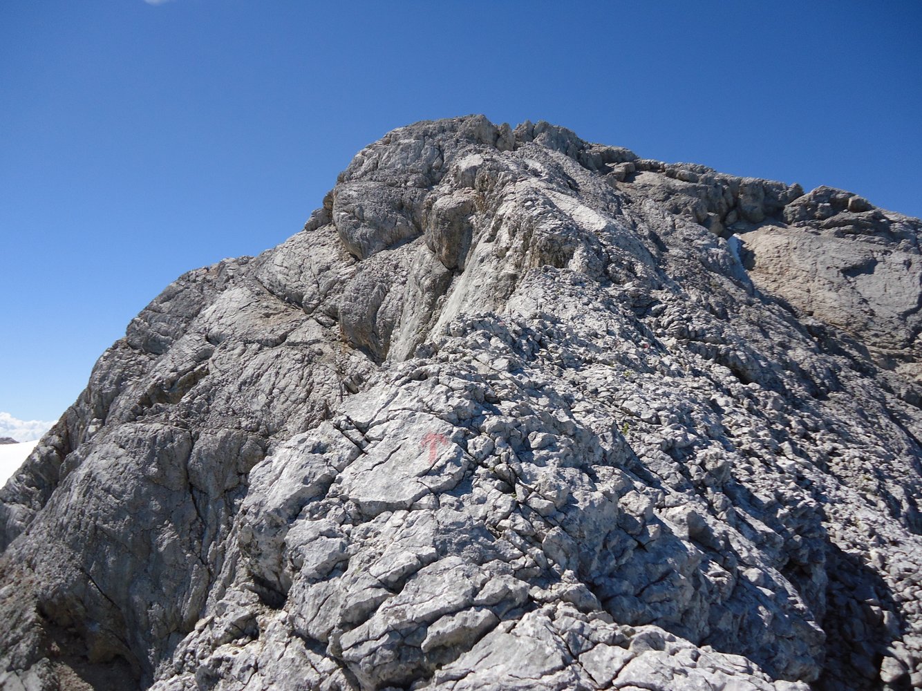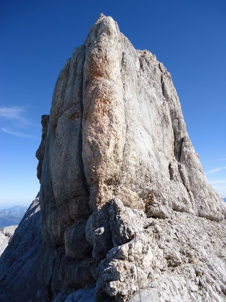 Vom Einstieg die Wand hinauf bis zur ersten Steilpassage (C/D), danach plattig (B) und gestuft (B/C) höher. Nach einer Zick-Zack-Passage kommt ein kurzer Überhang (C/D), danach leichter auf ein Schuttband. Plattig und leichter höher (A/B kurz B/C) bis man leicht (A/B) zur Simonyscharte quert (Fluchtmöglichkeit aus der Tour). Von der Scharte weiter auf dem Grat (B) der flach (A/B), dann wieder steiler (B) wird. Nach einer neuerlichen Flachpassage erreicht man einen senkrechten Pfeiler (C), der die letzte schwere Stelle darstellt. Danach auf tlw. recht luftigem Grat (B und kurz B/C) zu einer Scharte, von dieser zu Fuß in ca. 10 Min. zum Gipfel.