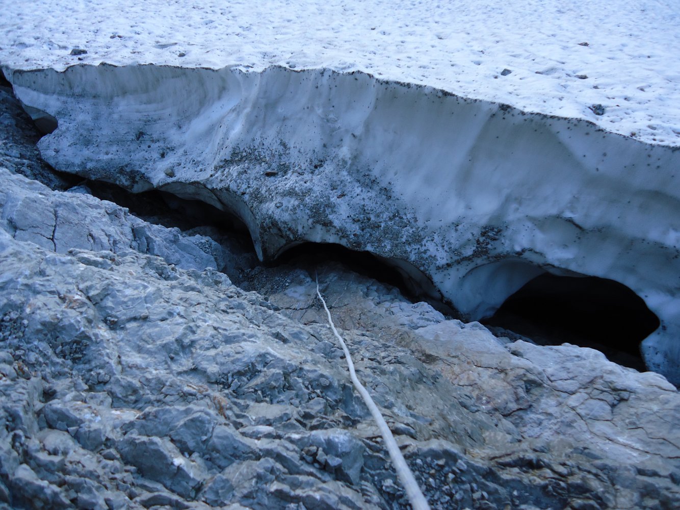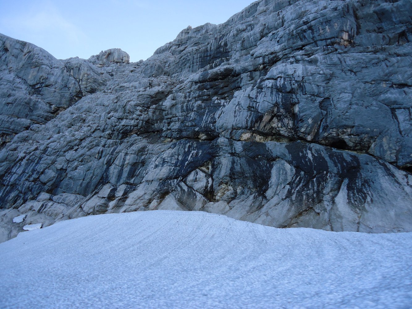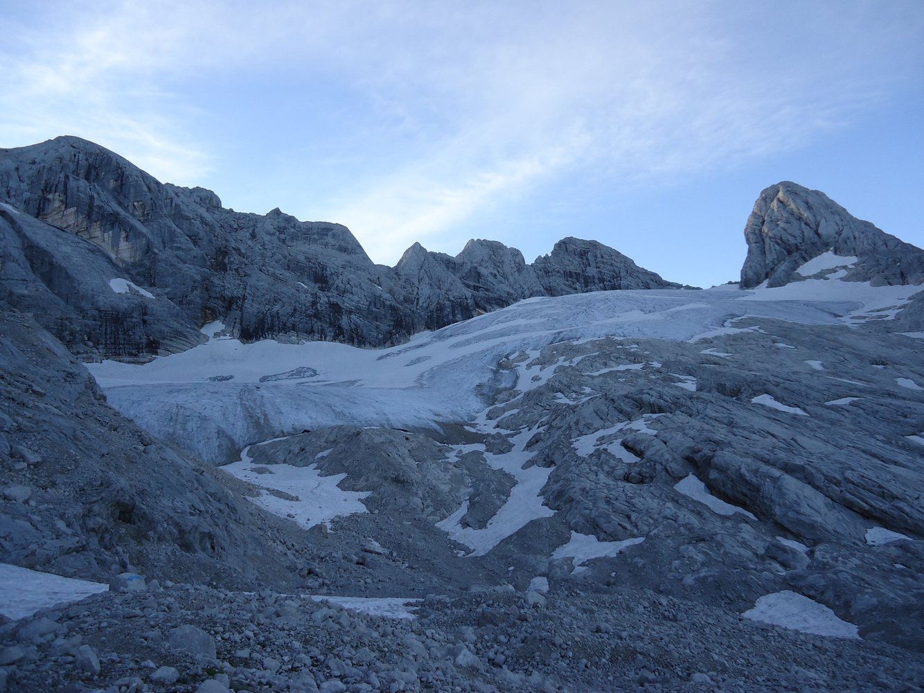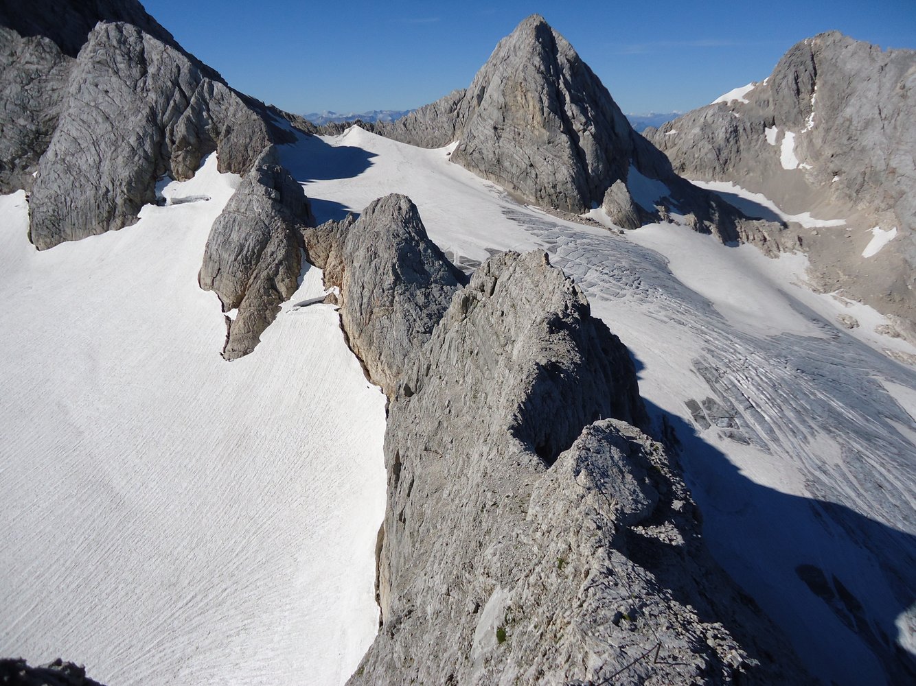 Von der Adamekhütte (dorthin in ca. 4,5 Stunden) kurz in Richtung Dachstein, dann gerade zum Gletscherlehrpfad (Gr. Gosaugletscher) und weiter auf dem Gletscher an die NW-Wand des Hohen Kreuzes. Der Einstieg ist bei einer höhlenartigen Nische unter einer steilen, wasserzerfressenen Wandzone.
