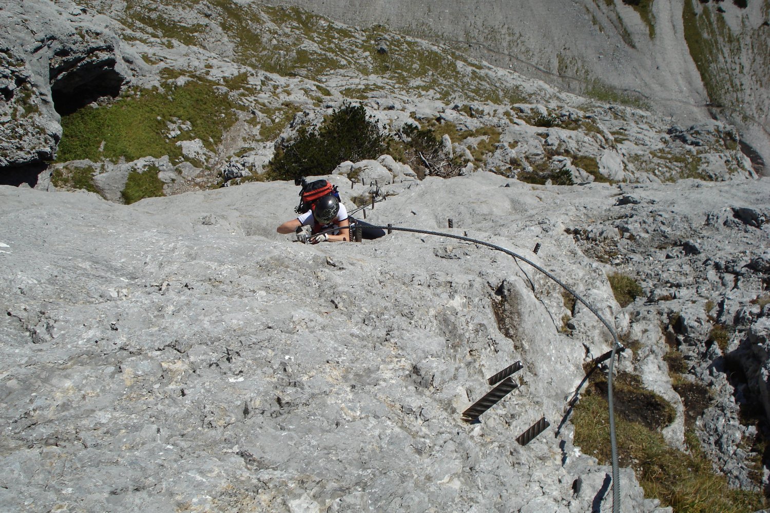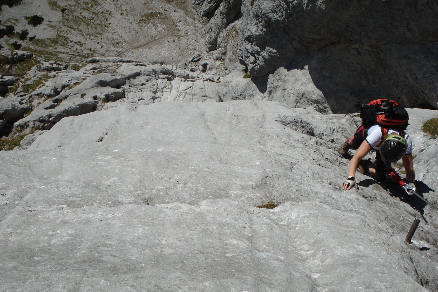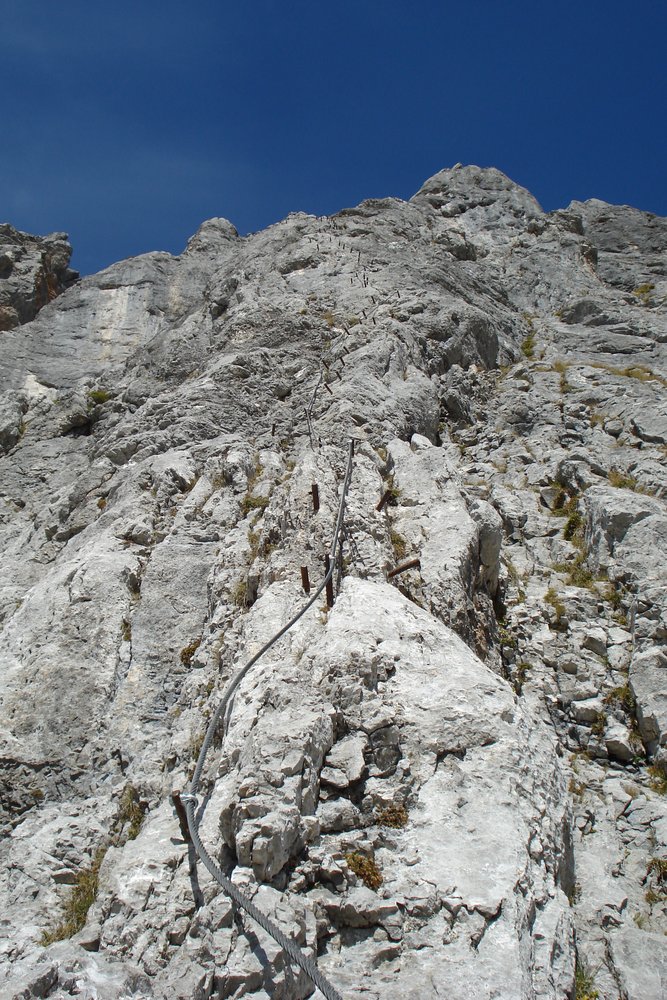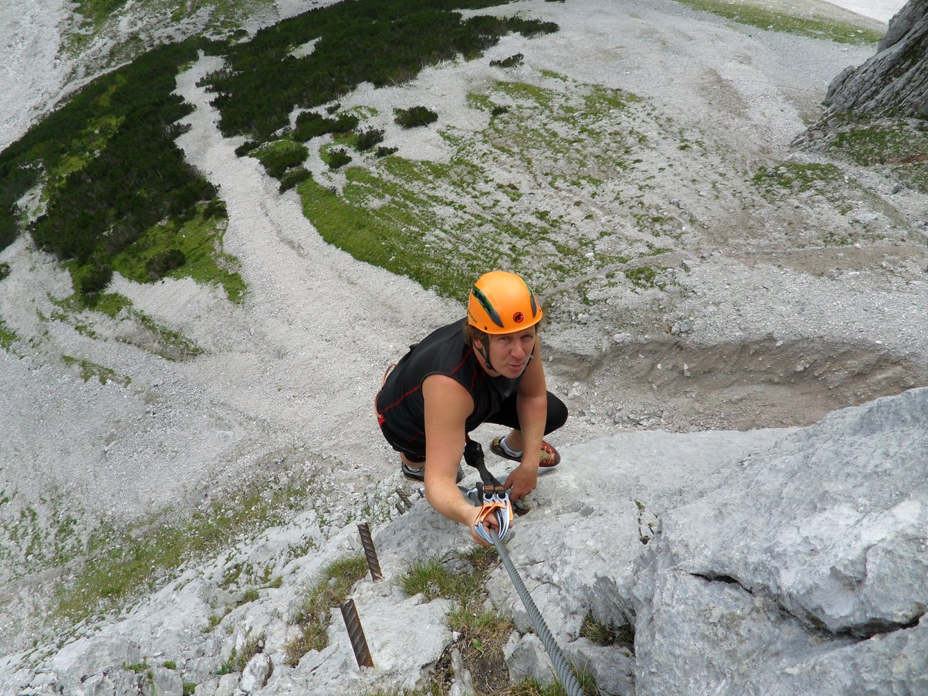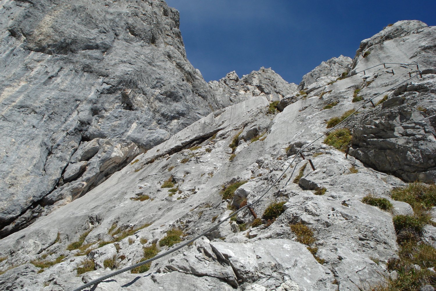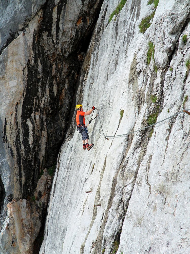 Kompl. Klettersteigausrüstung und Helm (siehe oben!). Beim Zustieg im Frühjahr sollten die Altschneefelder nicht unterschätzt werden (Leichtsteigeisen u. Pickel).