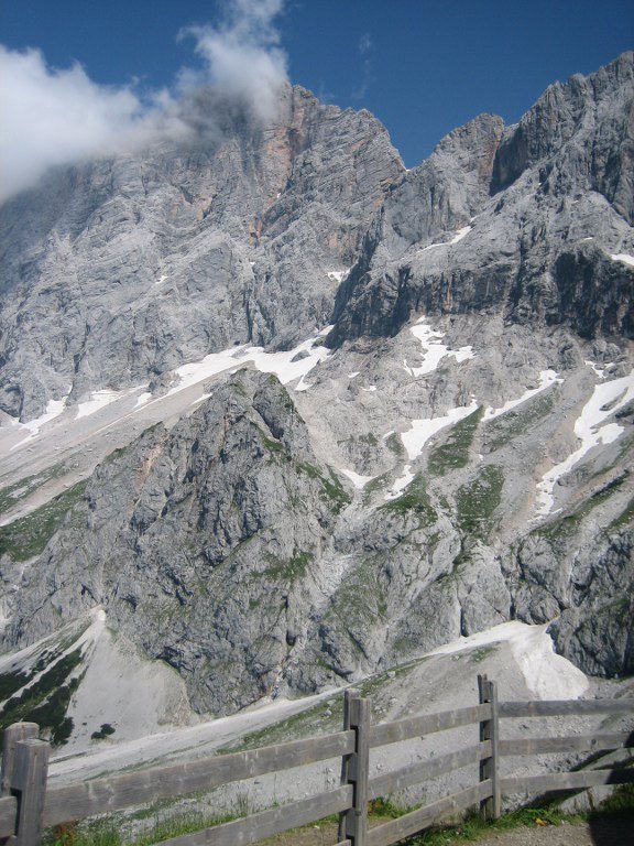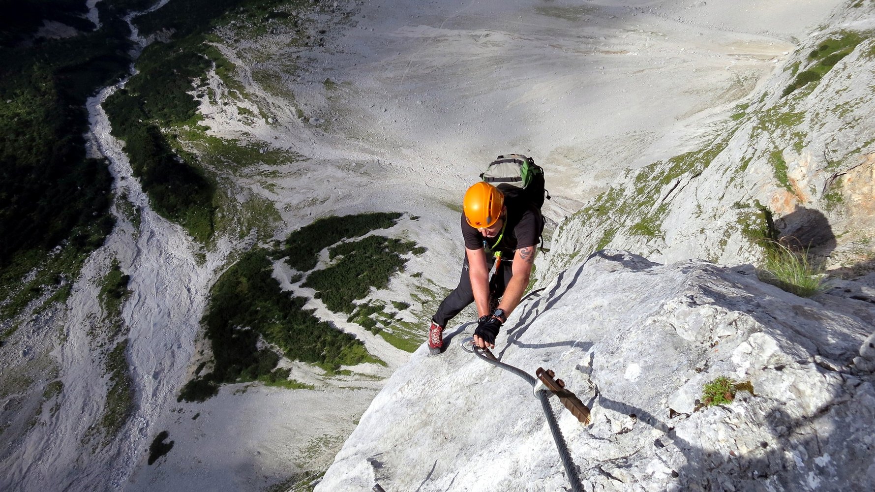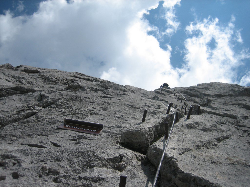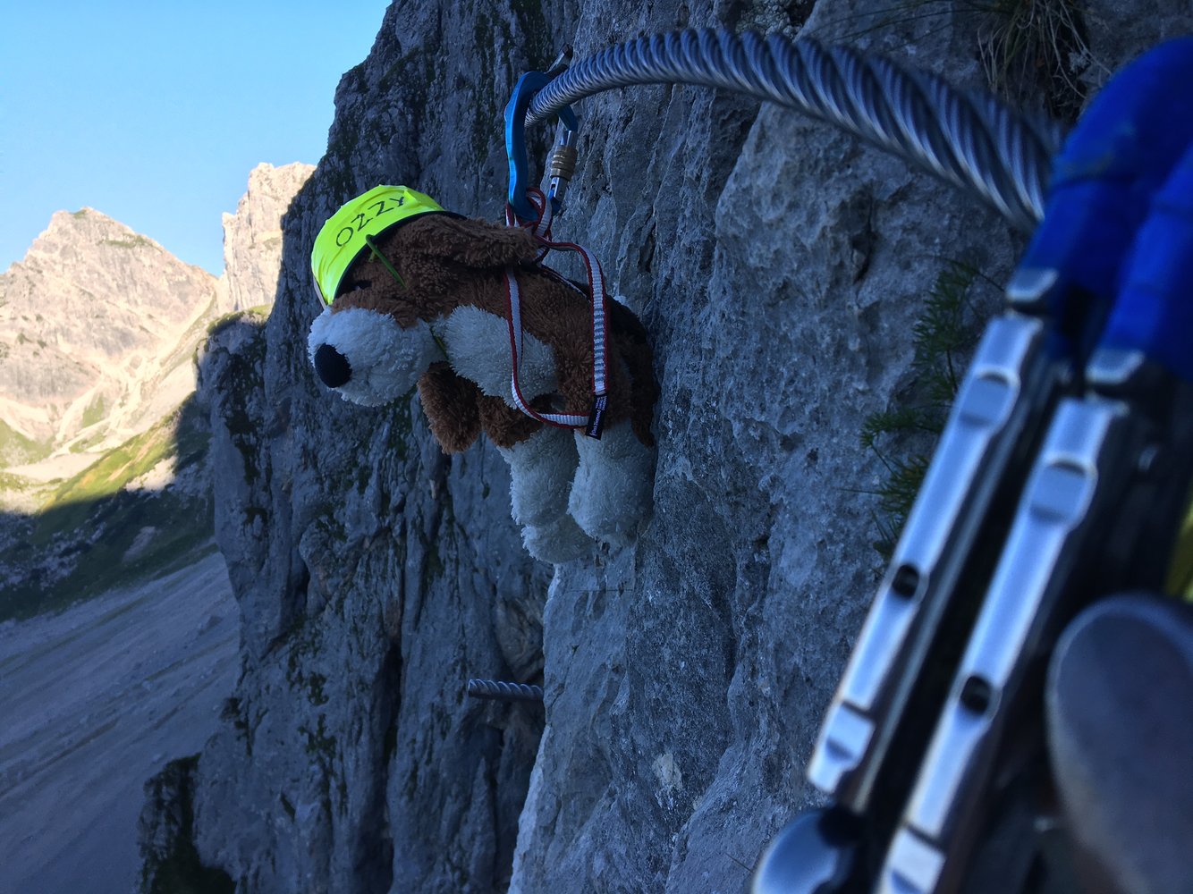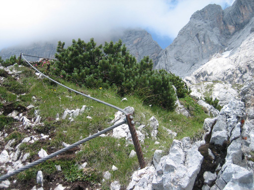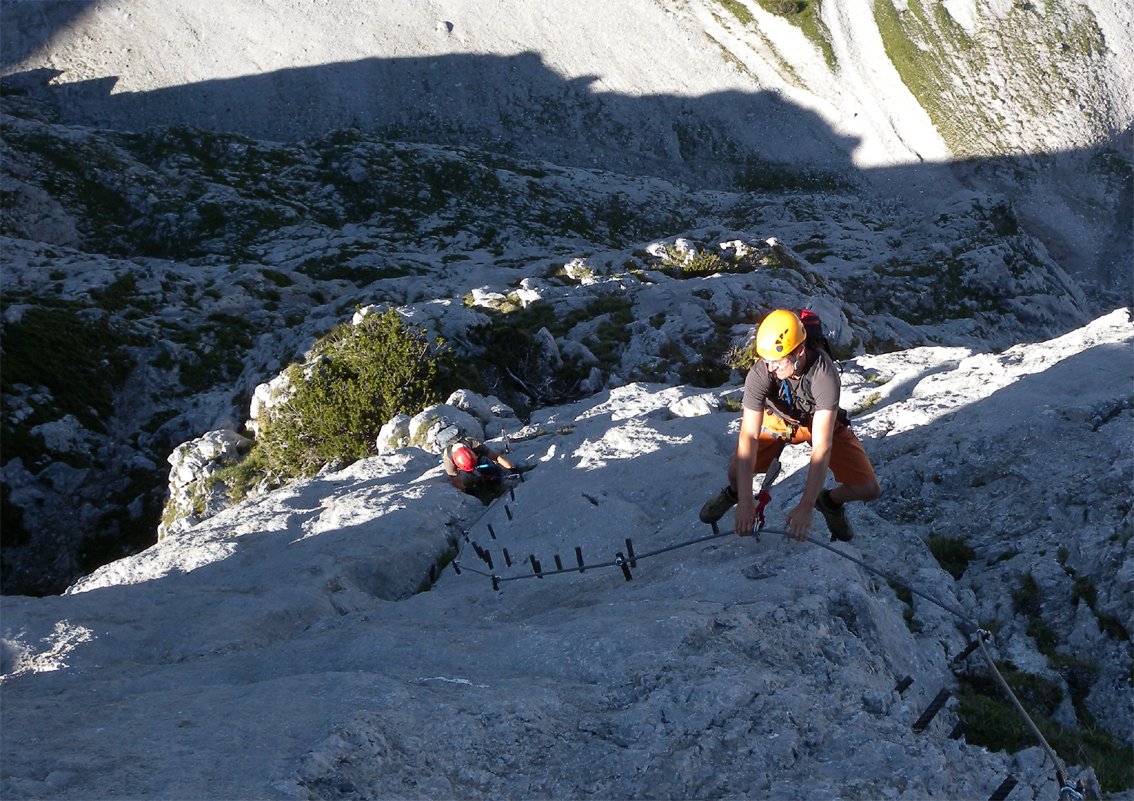 Kompl. Klettersteigausrüstung und Helm (siehe oben!). Beim Zustieg im Frühjahr sollten die Altschneefelder nicht unterschätzt werden (Leichtsteigeisen u. Pickel).