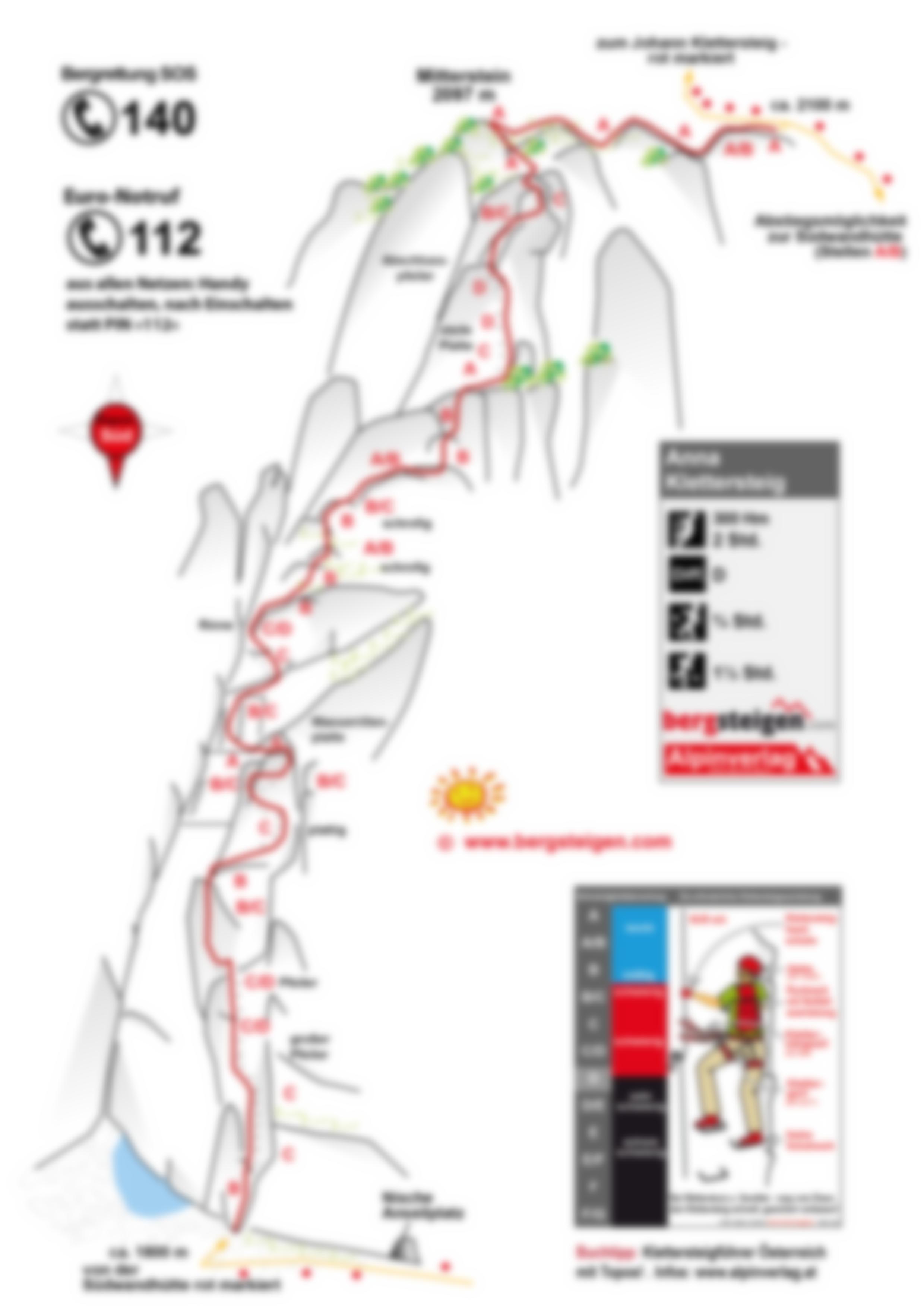 Von der Talstation auf gut markiertem Weg in 20 Min. zur Dachsteinsüdwandhütte (1871 m). Von der Hütte auf dem Pernerweg in Richtung Tor, bis man bei einer Tafel (Anna-Klettersteig) zum markanten Mitterstein rechts abzweigt. Entlang der Steigspuren (rot markiert) zum Einstieg unter der Wand.