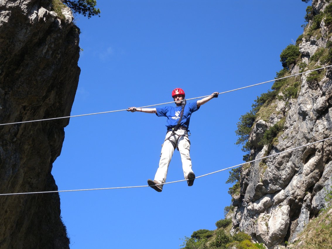 An der Pfeilerwand hinauf (C, Stellen C/D), bis man oben zur Seilbrücke quert. Über die Seilbrücke (B), an die Hauptwand. Eine leichte Querung (A) führt links zu einem Überhang (D). Nach dieser kurzen D-Passage klettert man in S-Linie (C/D) zu einem Flachstück (A/B). Eine Querung (A) und mehrere Stufen (B/C) führen zur zweiten Seilbrücke (B), danach kurz steil (B/C), dann leicht (A) hinauf zum Ausstieg.
