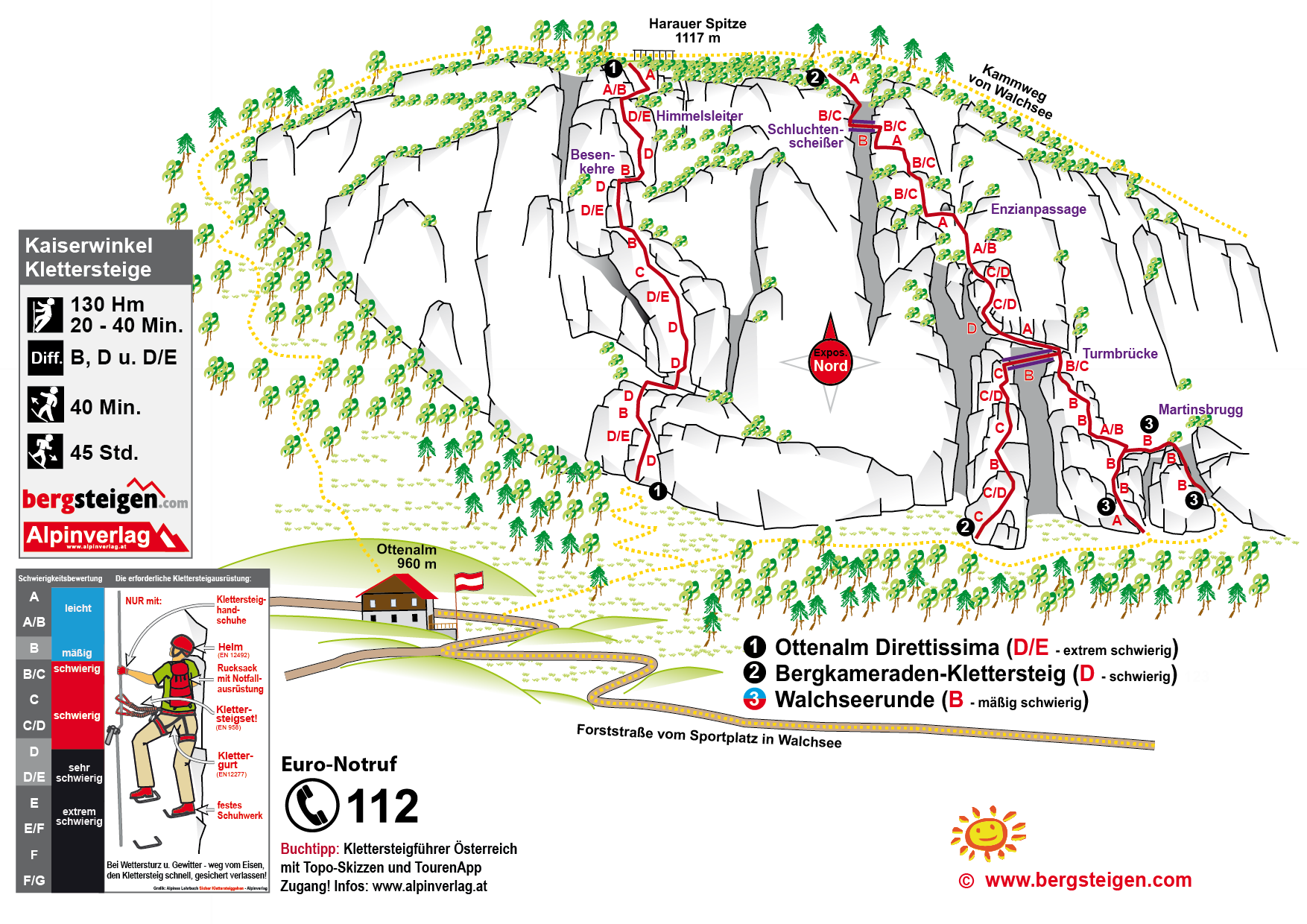 Die Steige sind nach Regentagen etwas rutschig. Rechts vom Klettersteig gibt es noch die Walchseerunde (B): Eine kurze, leichte Übungsrunde, man kann dort auch zur Seilbrücke hinaufsteigen (B/C). Die Auffahrt zur Ottenalm ist nur für Anrainerverkehr gestattet.
