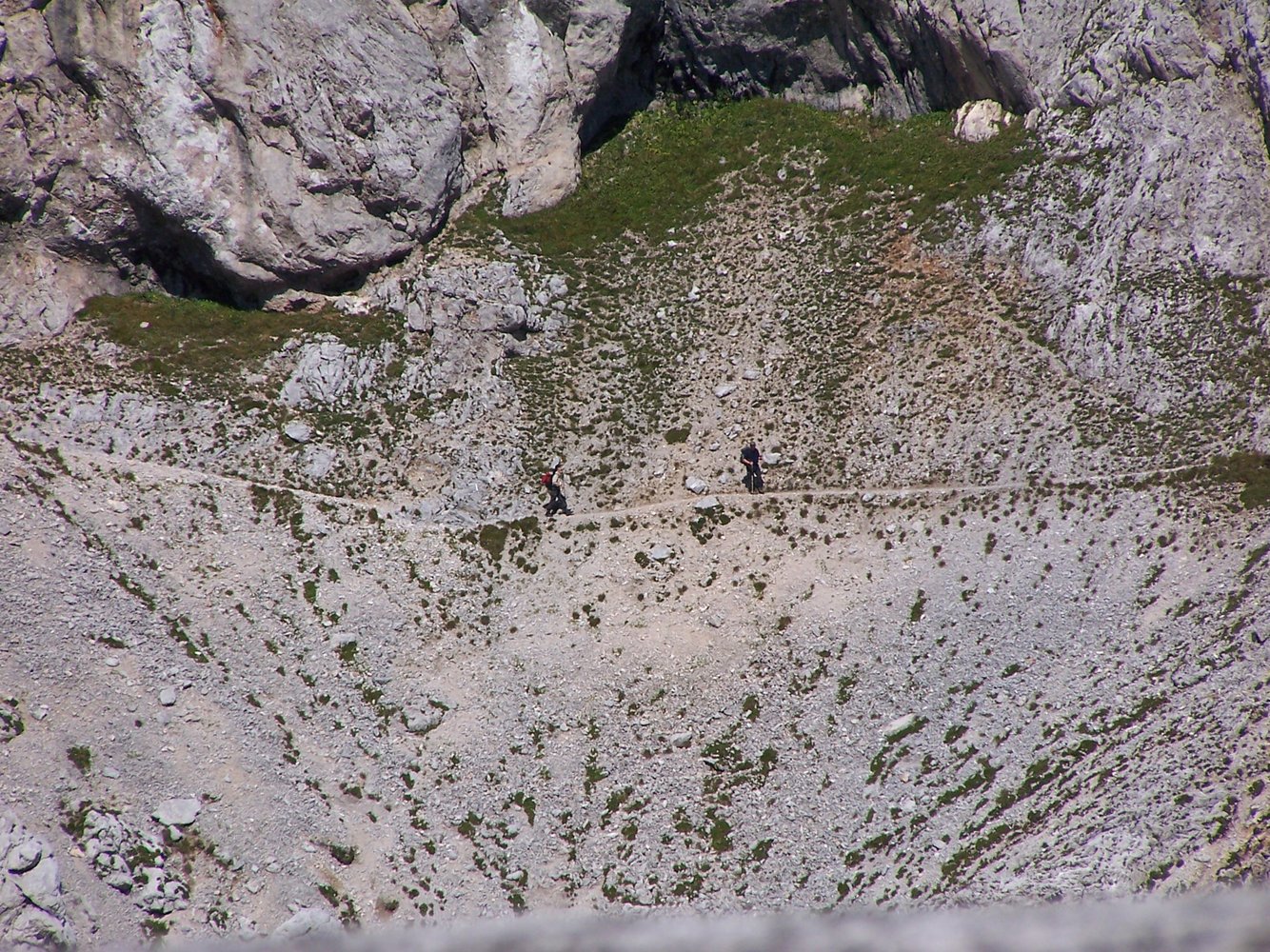 Wer vom Waxriegelsteig kommt kann über Schlangenweg (siehe Zustieg) oder den Karl Kantner Steig (A/B) absteigen.