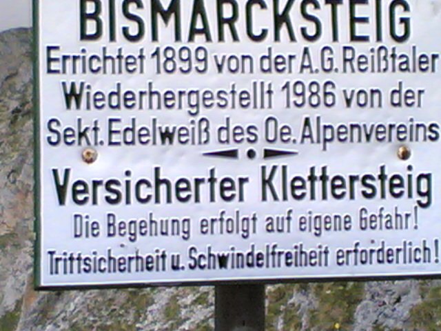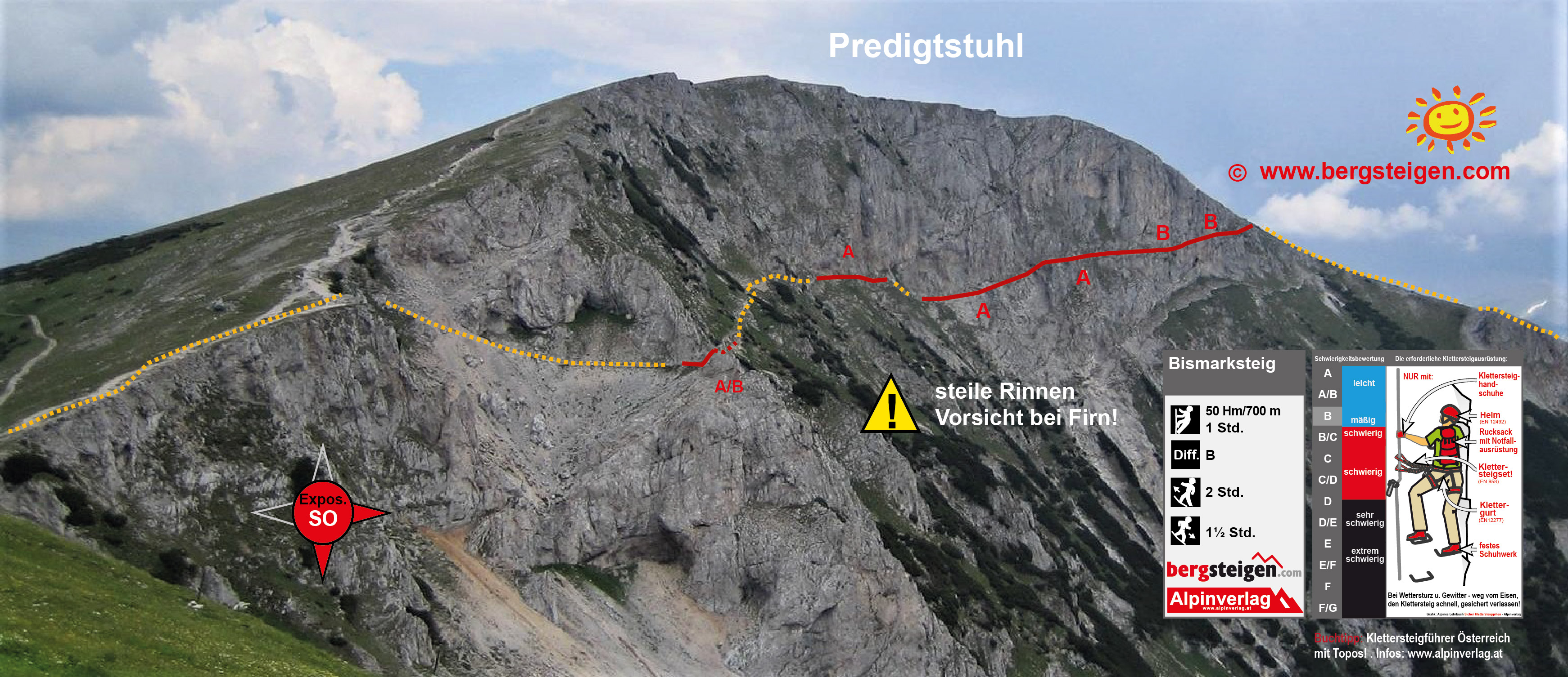 Der Verlauf des Bismarcksteiges ist schon von der Straße aus sichtbar. Er quert die Felshänge des Predigtstuhl 1902 m, und stellt damit eine interessante Verbindung zwischen Karl-Ludwig-Haus und dem Waxriegelhaus dar. Auch als Alternative für eine Besteigung der Heukuppe vorbei am Waxriegelhaus ist er durchaus zu empfehlen (mit Zwischenstop im Karl-Ludwig-Haus). Der rd. 700 Meter lange Steig wurde saniert und ist somit wieder gut begehbar. Trittsicherheit und Schwindelfreiheit sind aber Pflicht, Anfänger und Kinder sollten an ein kurzes Sicherungsseil genommen werden. Im Frühjahr und Anfang Winter sollte man die Schneefelder nicht unterschätzen und sich lieber einem anderen Ziel zuwenden. Die Hänge unter dem Predigtstuhl sind sehr steil!
