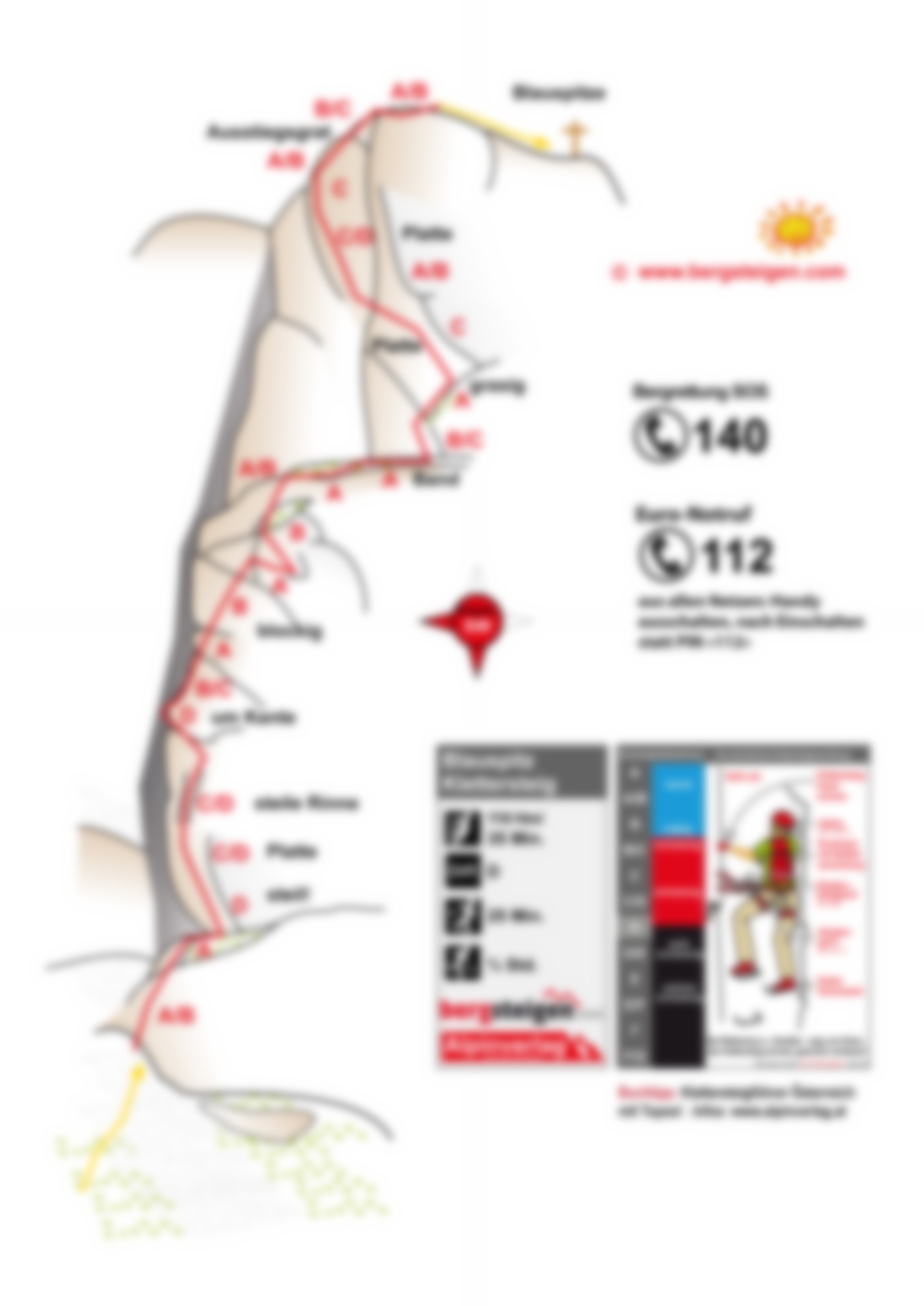 Vom Einstieg in einer Rinne auf einen kleinen Felsrücken (A/B), welcher zu einer leichten Querung (A) führt. Es folgt die erste Schlüsselstelle in Form einer glatten Plattenverschneidung (D). Anschließend führt eine plattige Querung (C/D) in eine steile Rinne (C/D). Es folgt die zweite Schlüsselstelle in Form einer ausgesetzten Kante (D). Über einen luftigen Grat (B/C) wird leichteres Gelände (A bis B) erreicht. Eine leichte Querung (A) führt zu einer Platte (B). Über leichtes Gelände (A bis A/B) erreicht man eine weitere Platte (B/C). Es folgt eine grasige Rampe (A), welche zu einer schönen Platte (C) führt. Um eine Kante herum (A/B) geht es zum letzten Aufschwung. Zuerst über eine Platte (C/D), später direkt an der Kante (C) steigt man mit Hilfe zahlreicher Klammern luftig empor. Der flache Gipfelgrat (A/B) ist durch einen Spreizschritt (B/C) unterbrochen und führt direkt zum kleinen Gipfelplateau.