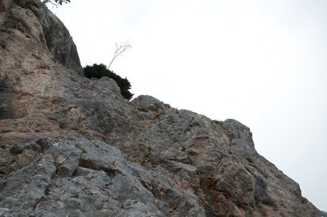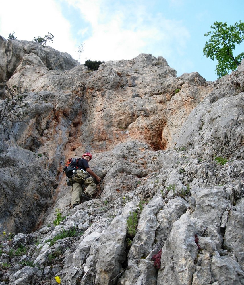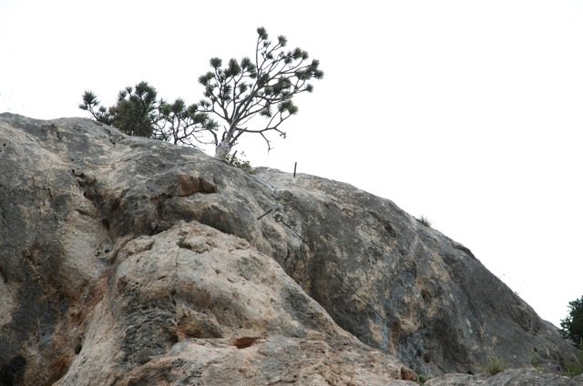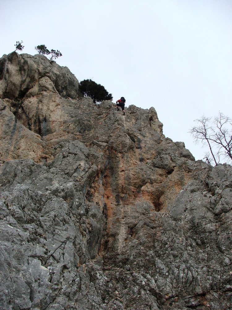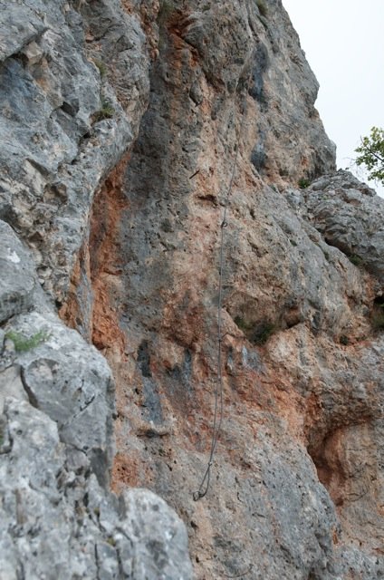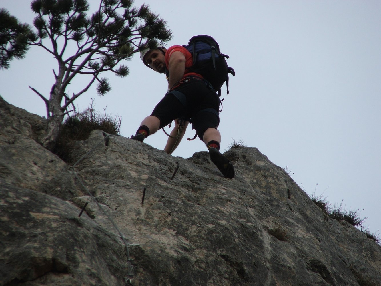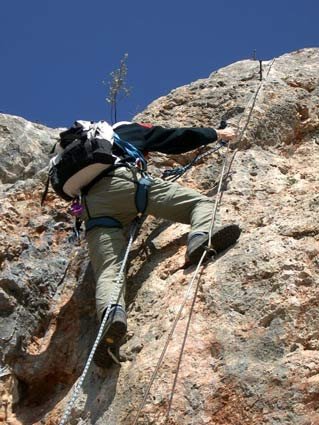 Anfangs C und später extrem anstrengend mit Hilfe eines Stahlseils und Trittstiften im Abstand von zirka einem Meter hoch (D/E). Nach dem Überhang (E), der die Schlüsselstelle darstellt, wird das Gelände leichter (C). Einige Meter im leichten Gelände (A) bringen zu einer abdrängenden und sehr ausgesetzten Querung (C/D). Der zweite Aufschwung beginnt mit einem Überhang (C/D). Ohne weitere Schwierigkeiten (B/C) wird der Ausstieg direkt bei der Windfahne der Sonnenuhrwand erreicht.