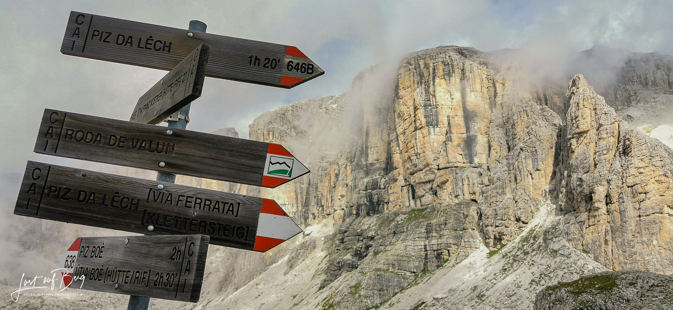 Boèseekofel-Klettersteig: Über einen kleinen Aufschwung (C) links auf ein Band (A) und gleich wieder zurück durch eine kurze Rinne hinauf zu einer Wandstufe, die schwierig (glatt und nur Sicherungsseil, C und C/D) überwunden wird. Weiter an der Wand rechts des großen Spaltes aufwärts (B) und bald plattig (B) nach rechts um die Kante auf einen kleinen Absatz queren. Dort gerade durch eine Rinne aufwärts (B) zu einer kleinen, extrem steilen und trittarmen (C/D) Wandstufe, die auf das große Band rechts der Leiter führt. Über die erste lange Leiter hinauf (B) und über die überhängende Felsstufe an Klammern (schwierig, B/C) zur nächsten, etwas leichteren Leiter (B), die zur letzten sehr schweren Klammernpassage (C) führt, die auf einem Absatz endet. Wenige Meter aufwärts (B, dann leichter) auf das Gipfelschuttfeld und in ca. ½ Std. auf einer Wegspur zum Gipfel. Normalweg (auch Abtieg nach der Ferrata): Von der Bergstation Boè Gondelbahn rechts haltend auf dem Weg 646 an der Nordseite des Berghanges vorbei, bis flacheres Gelände einen Durchstieg (stellenweise versichert, kurz B und eine Leiter) auf den Kamm oberhalb des Boè-Sees erlaubt. Oben angekommen, kann man den schönen Blick auf den tief unten liegenden See genießen. Weiter dem Kamm entlang in eine flache Scharte, 2629 m und gleich danach über eine kurze, aber steile Wandstufe (Schlüsselstelle B) an Klammern hinauf zum flachen Gipfelhang, dem man noch eine gute ½ Std. über Geröll zum höchsten Punkt folgt (Bergstation der Boè Bahn – Gipfel, B 715 Hm, 2 ½ Std.).