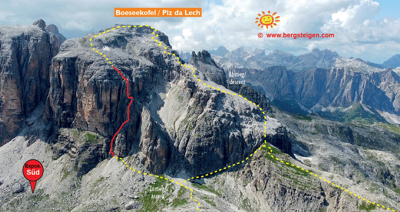 Der sehr sportlich angelegte Boeseekofel Klettersteig (Ferrata Piz da Lech) bietet kurzen, aber sehr steilen Klettersteiggenuss in meist sehr robustem Fels, wobei der Steig über weite Strecken nur mit einem Sicherungsseil versehen ist (wenig künstlich Tritthilfen in der Tour). Das Beste kommt auch bei dieser Ferrata, wie so oft, zum Schluss in Form von zwei langen und senkrechten Eisenleitern. Dank der Seilbahnen, ist der im Vergleich mit anderen Dolomitensteigen eher junge Eisenweg sehr einfach zu erreichen. Vom Gipfel genießt man ein fantastisches Dolomitenpanorama (u. a. auf den meist mit Schnee bedeckten Gletscher der Marmolada) und einen schwindelerregenden Tiefblick auf das imposante, von steilen Felsmauern begrenzte Mittagstal. Auf dem in diesem Buch empfohlenen Abstieg über den Normalweg zum Grep de Mont umgeht man geschickt die hässlich planierten Skipisten und hat einen schönen Ausblick auf den Boè See und die heile Dolomitenwelt am Sassongher.