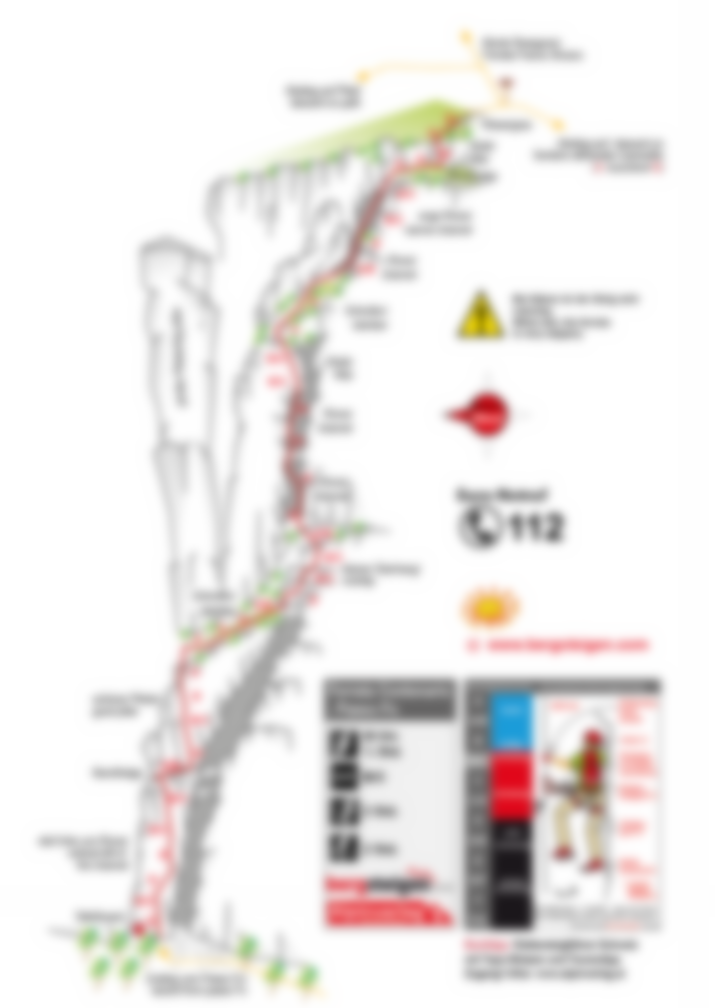 Siehe Topo. Die schwierigen Passagen sind an Pfeilern und kurzen Aufschwüngen.