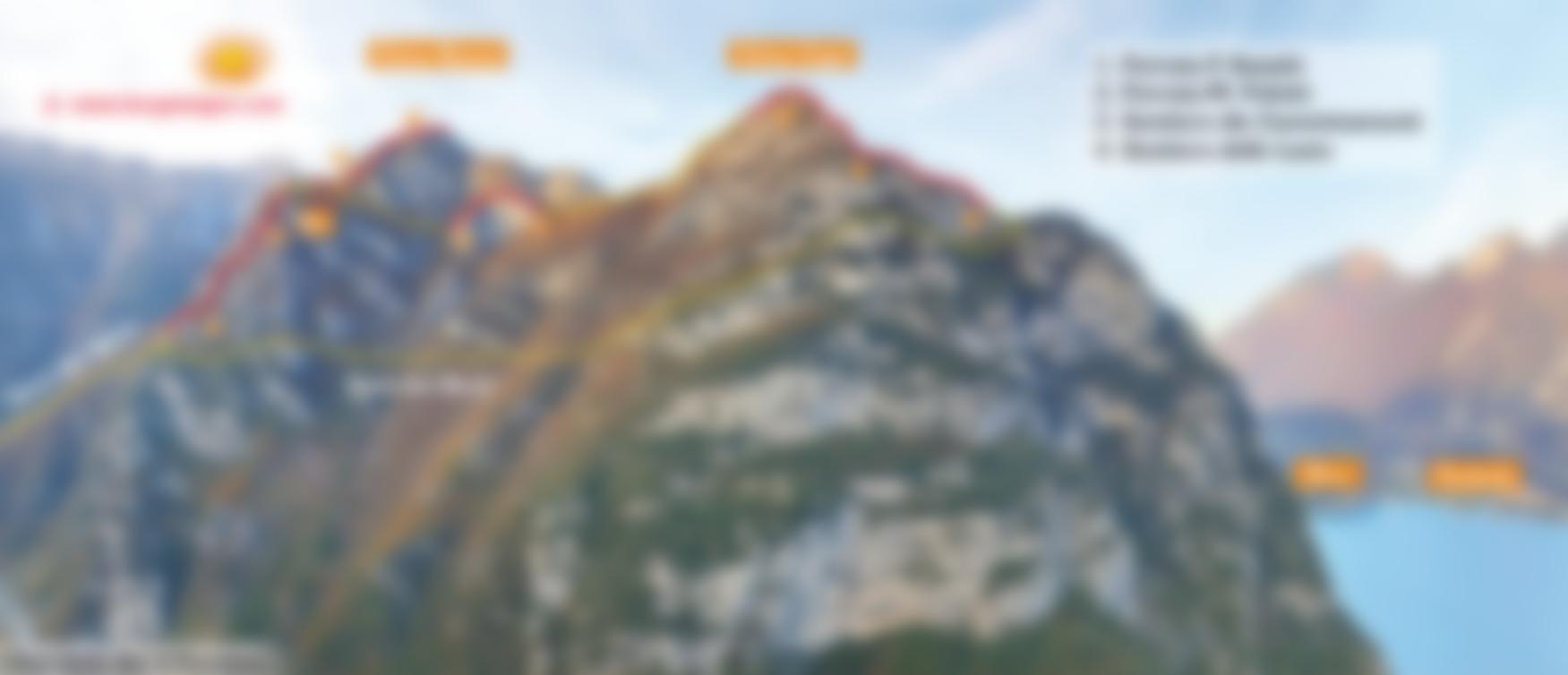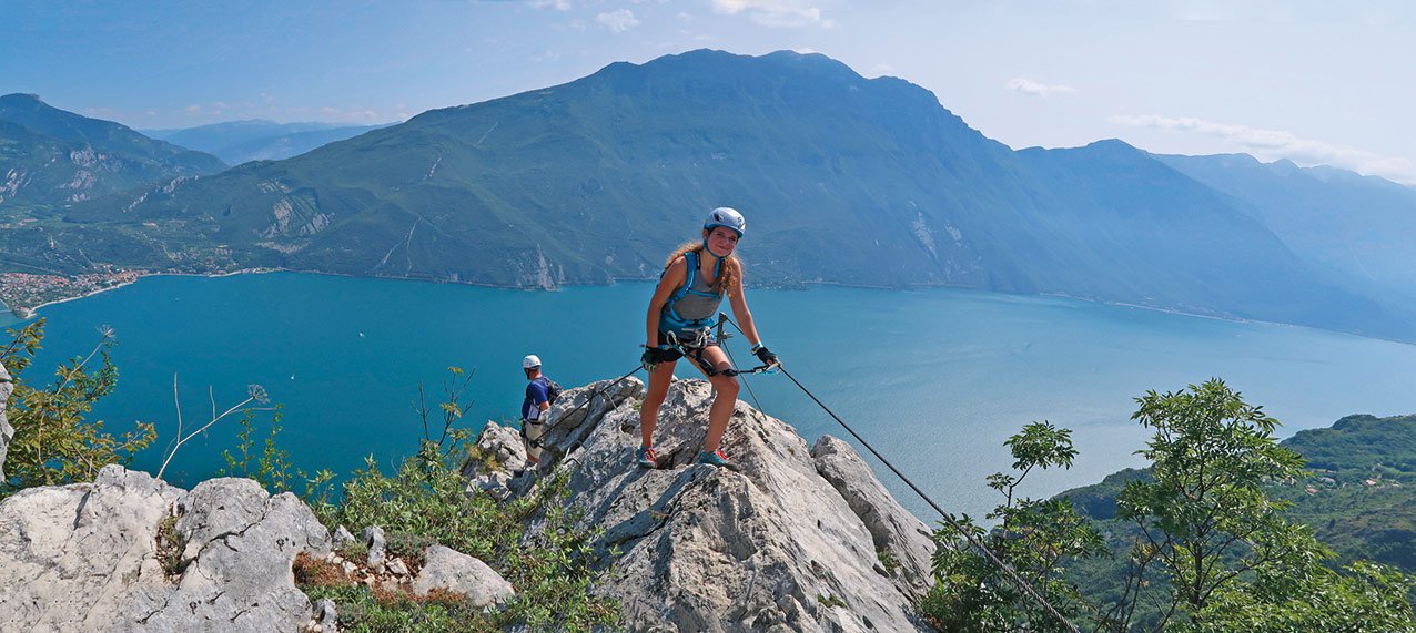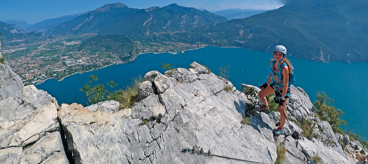 Unweit der Seemetropole Riva del Garda klettert man hoch über den blauen Fluten des Gardasees an der Südkante zum Gipfel der Cima Capi empor, von dort führen zwei weitere, sehr schön hergerichtete, leichte Klettersteige auf das Dach der Runde, den Gipfel der Cima Rocca. Egal ob man von Biacesa oder direkt von Riva del Garda zum Einstieg aufbricht, taucht man durch dichten Buschwald zu leichten, aber schönen Kletterpassagen und luftigen Graten empor. Oben dann das kühle Finale im Inneren der Cima Rocca. Der Gipfel des Berges lässt sich entweder über steile, versicherte Schützengräben oder in einem markierten Kavernensystem aus dem Ersten Weltkrieg im Inneren erforschen. Egal ob unter- oder oberirdisch, die landschaftlich schöne Klettersteigrunde ist vor allem bei Einsteigern sehr beliebt!