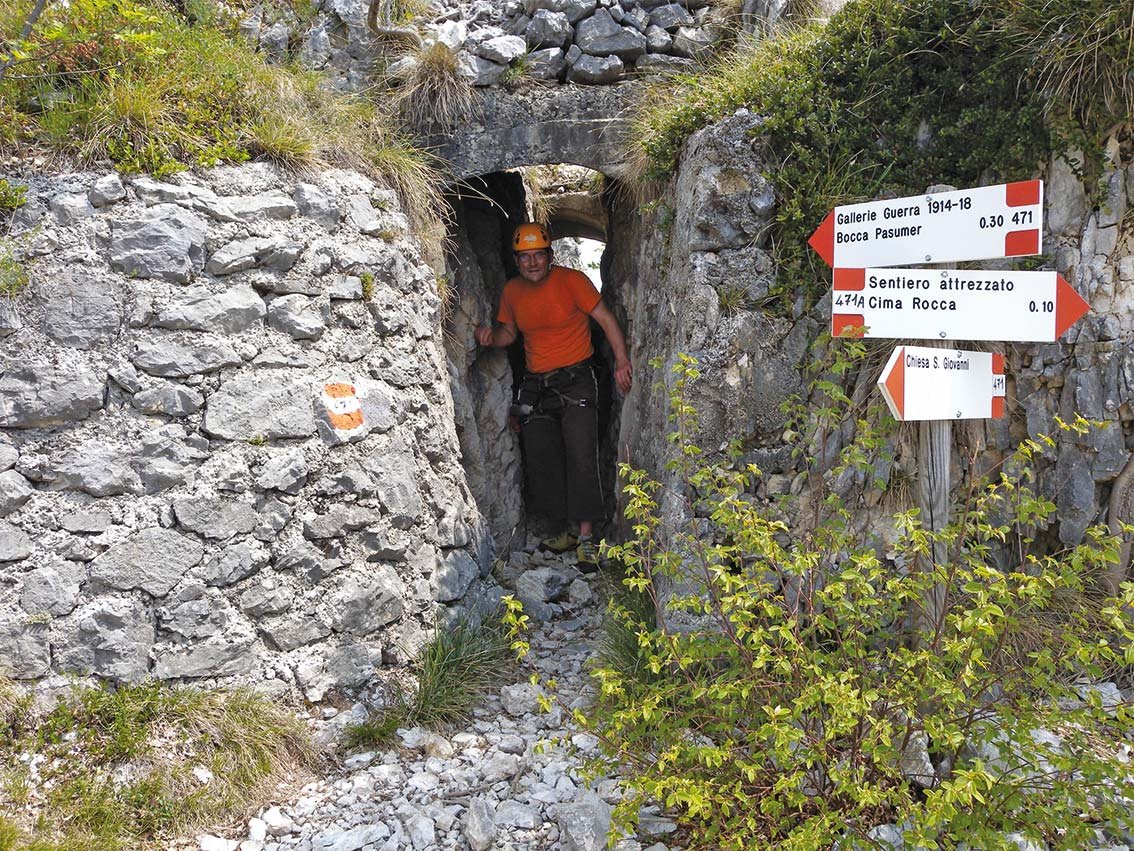 Route - Klettersteigrunde: Via ferrata Susati (B): Bei der Tafel gestuft aufwärts zu den ersten Seilsicherungen (A u. A/B), danach folgt eine schöne Gratpassage (A). Leichtes Gelände (A) führt vor dem Gipfel über eine kurze Seilpassage (A) zur Fahne. Zuerst etwas absteigen, dann auf sehr schmalem Grat (exponierter Grat!) zur Abzweigung (rechts geht es zur Bocca Pasumer). Via ferrata Foletti (B): Durch einen Stellungsgang erreicht man die Sicherungen (A) bei einer Platte, steigt dann auf ein Band (A/B) hinauf und quert wieder eine schöne Platte (A). Zuletzt steiler Abstieg (B) zum Ende des Steiges. Auf dem Weg 460 zur Biwakhütte Arcione mit der Kapelle (von dort Abstieg nach Biacesa möglich, Weg 460). Sent. dei Camminamenti (A/B): Im Zickzack aufwärts zu einem Stollen, dessen Ausstieg eine Leiter (A/B) ist. Weiter gestuft (A/B) und durch einen Stollen (gehen) erreicht man die Abzweigung der Gallerie d. Guerra. Entweder zuerst durch den Tunnel (gehen; Lampe) und dann über den Gipfel (kurze Stellen A/B) zurück oder umgekehrt. Wenn man den Steig nicht mehr absteigen will, kann man vom Nordausgang des Tunnels leicht (Stellen A) zur Boc. Pasumer und noch davor nach Biacesa absteigen. Sent. delle Laste (A/B): Ein leichter Zu- bzw. Abstiegsklettersteig zur Biwakhütte (kurze Stellen A/B), wenn man den unteren Teil des Sent. dei Camminamenti zurückklettert, kann man diesen in die Routen einbauen. Schwächere oder Familien mit Kinder wählen diesen Weg gerne für den Zustieg zur spannenden Gallerie d. Guerra.