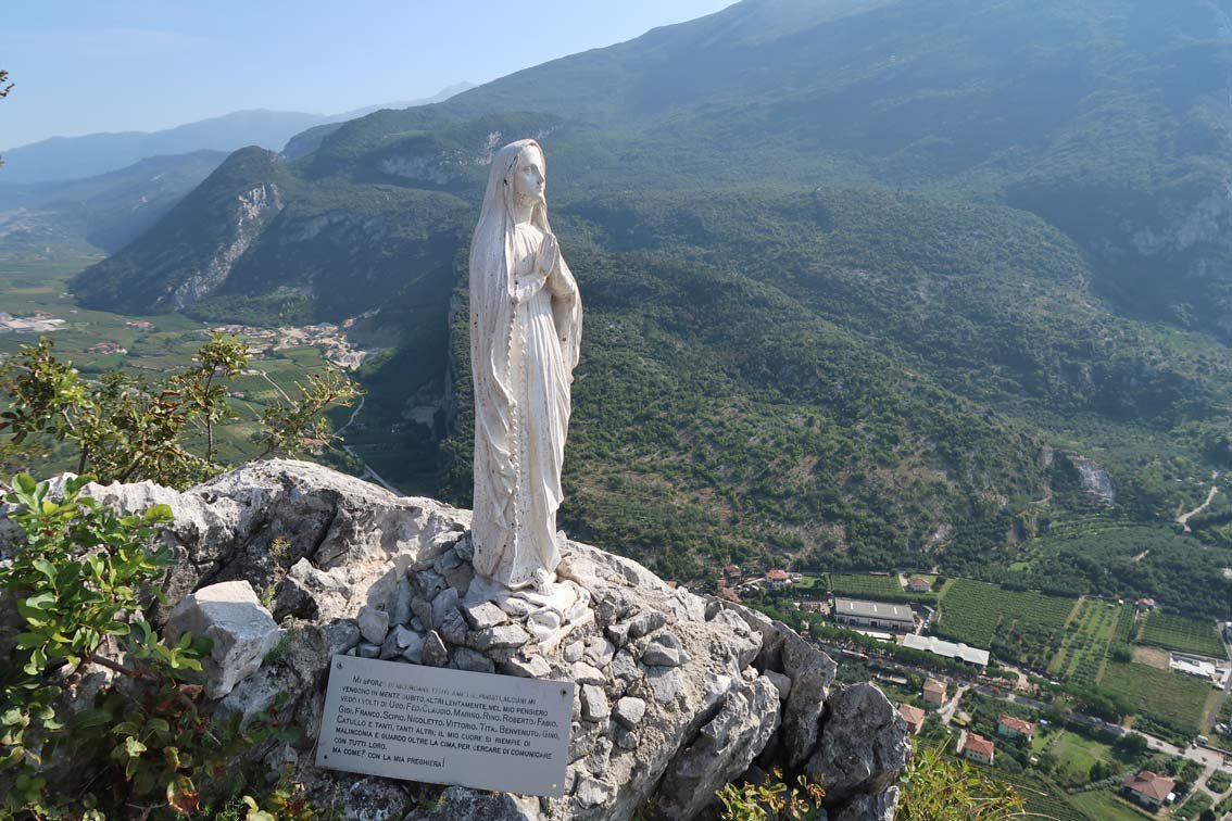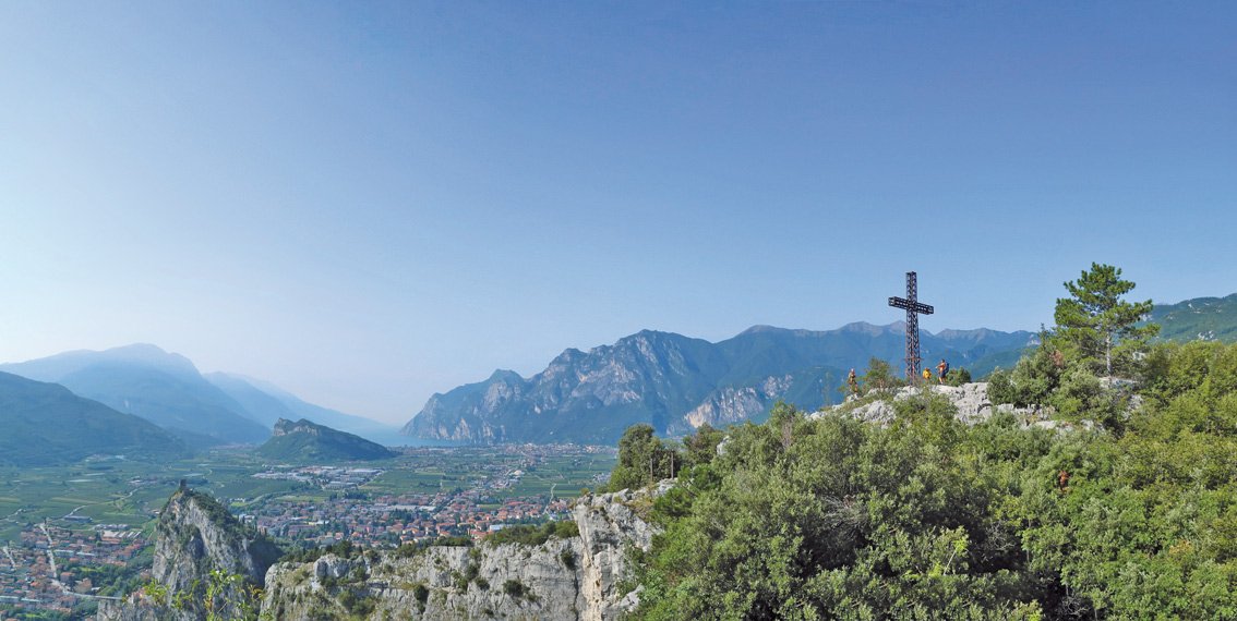 Vom Ausstieg zuerst über die Karstfläche der Markierung folgen und rechts zum Gipfelkreuz aufsteigen (nicht nach links oder gerade). Vom Kreuz über den markierten Weg hinunter nach S. Maria di Laghel und zurück nach Arco. In Arco durch die Fußgängerzone - vorbei an den Eisgeschäften und dem Cafe am Hauptplatz - zum Parkplatz bei der Brücke bzw. dort weiter auf der Straße zum Freibad.