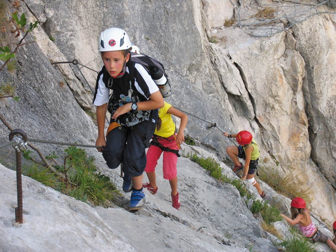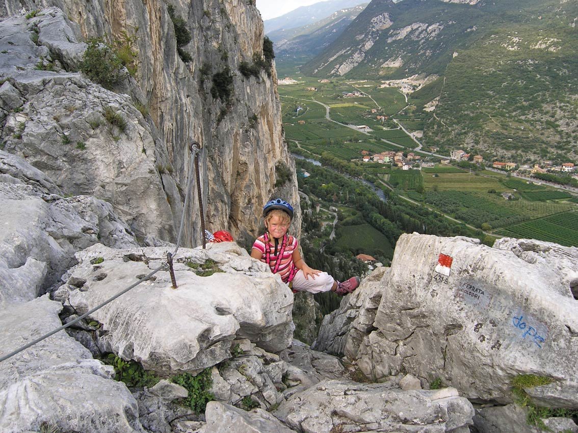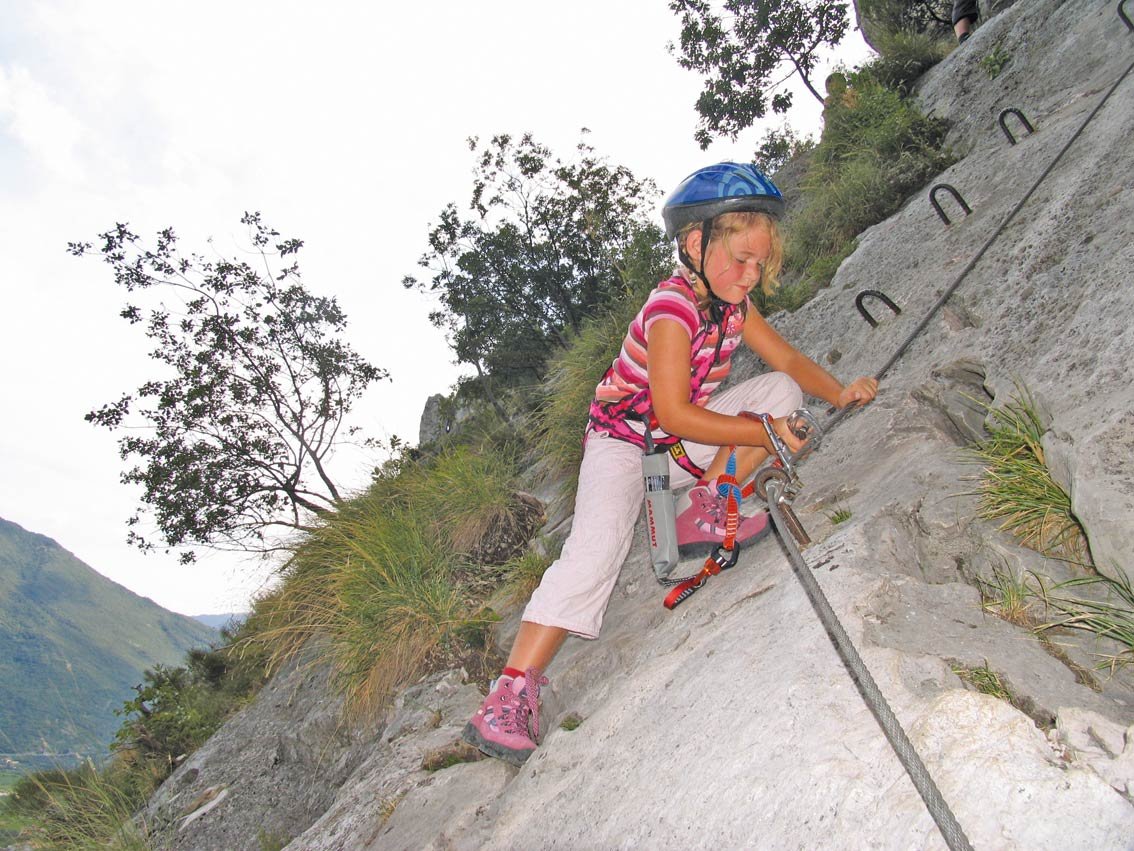 Schöner, wirklich attraktiverer Klettersteig entlang der imposanten Felswand rechts des Burgfelsens von Arco. Der Anstieg ist bis auf zwei kurze Passagen meist leicht, und somit auch für kletter erfahrene Kinder gut geeignet. Oben kommt man auf ein schönes Karstplateau und steigt dann auf der Rückseite des Berges wieder ab. Lohnend ist auf jeden Fall der Tiefblick ins Sarcatal und auf den Gardasee! Der Rückweg führt durch die schöne Altstadt von Arco - vorbei an einem Eisgeschäft.