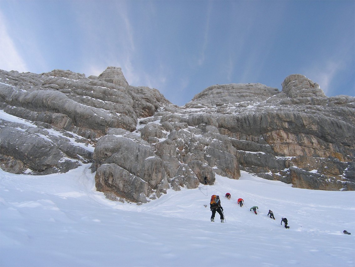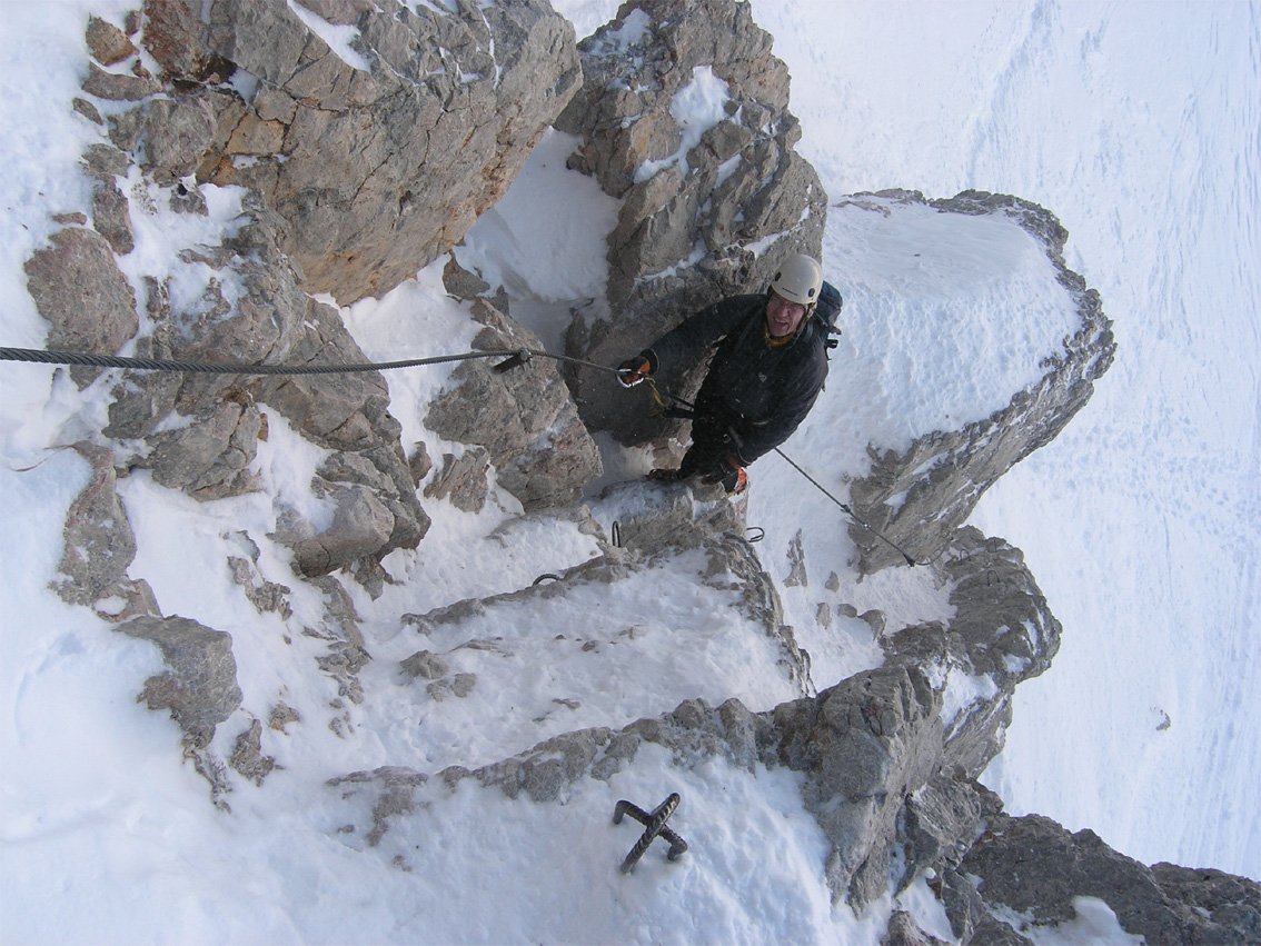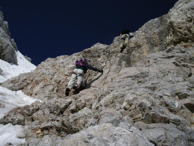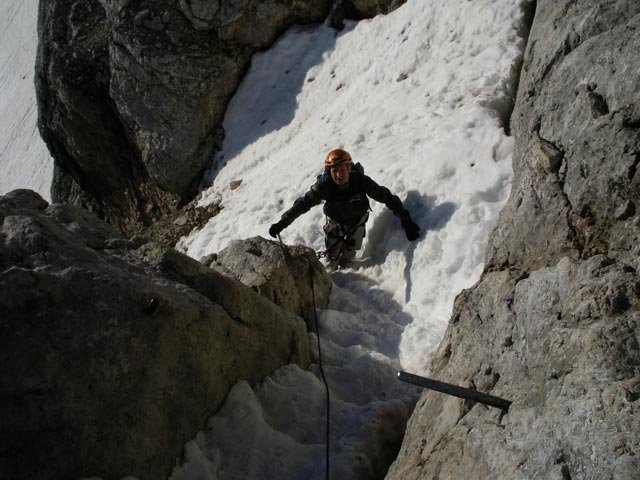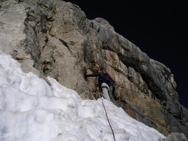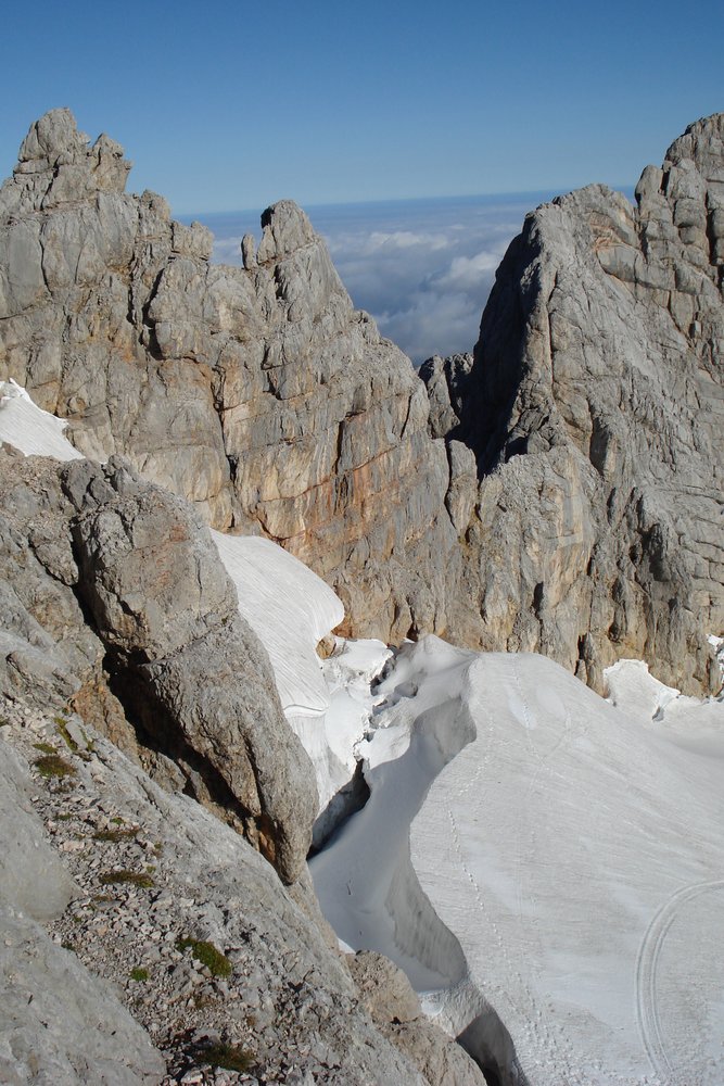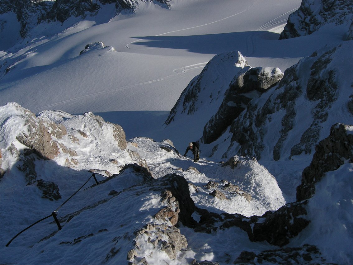Bereits vor der eigentlichen Randkluft lauern oft riese Gletscherspalten, die man oft nicht gleich erkennt. Aus Gletscher-Gefahren Sicht sicherer ist der Anstieg über die Schulter, der ebenfalls versichert und auf bergsteigen.com beschrieben ist.
