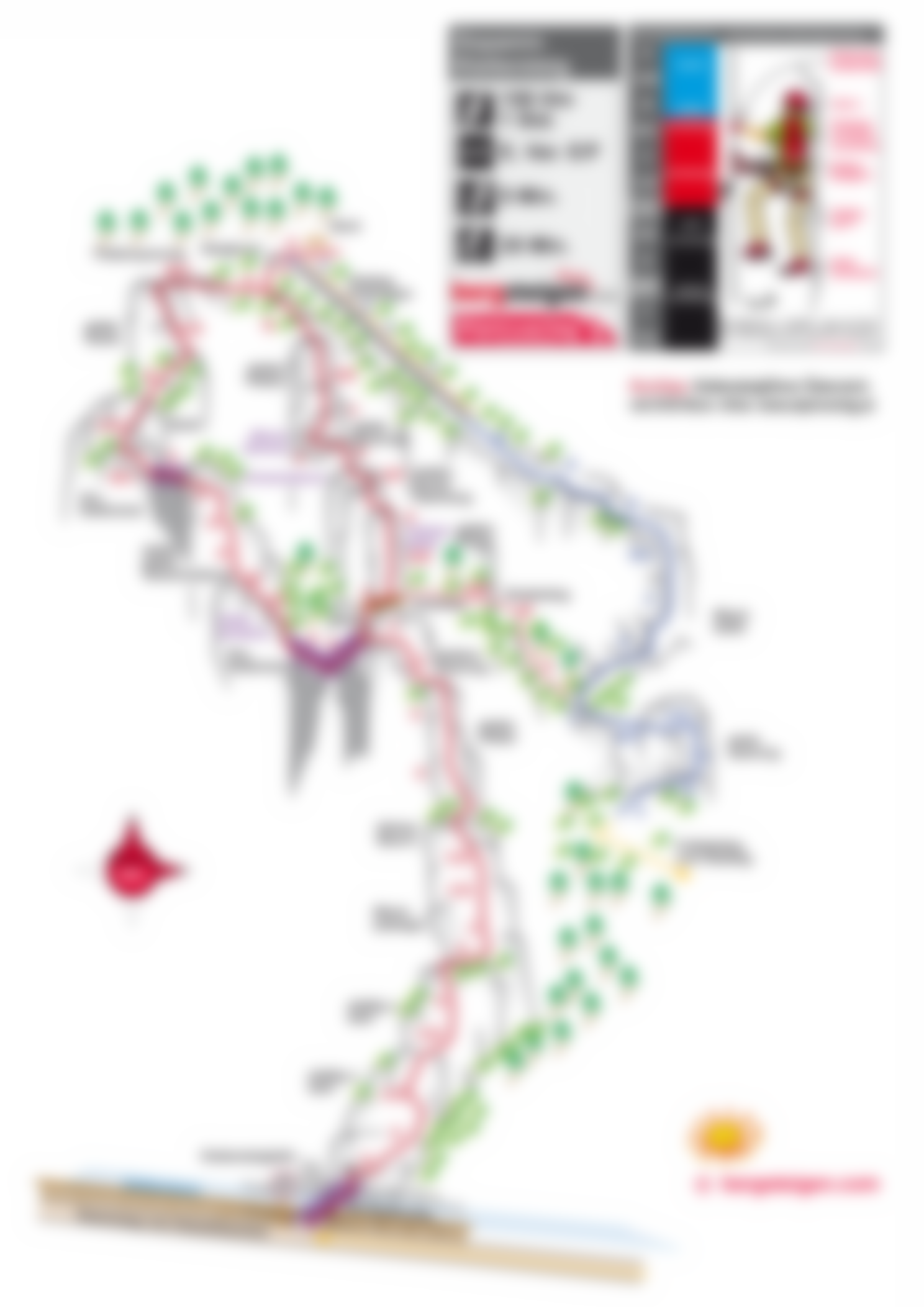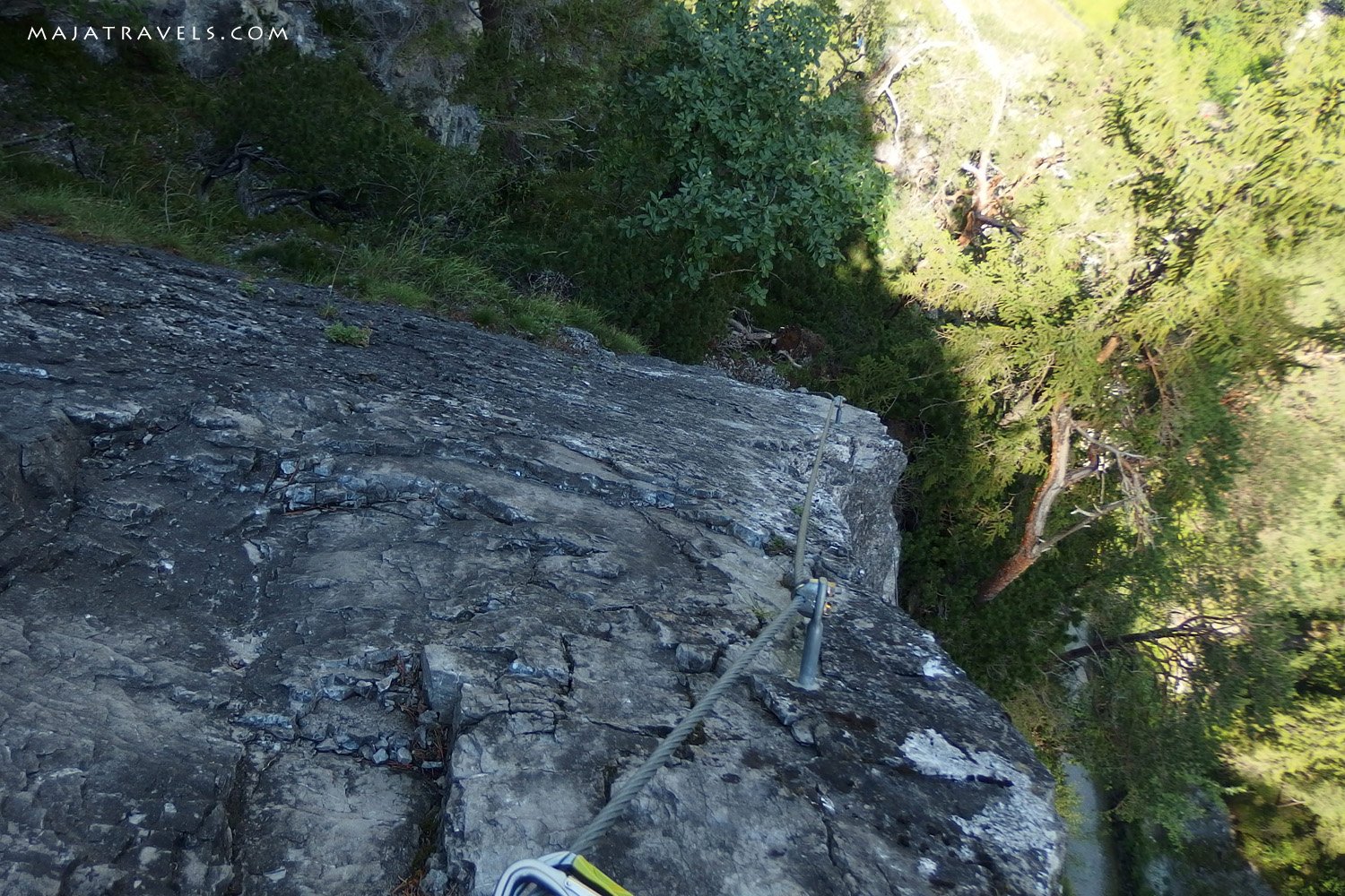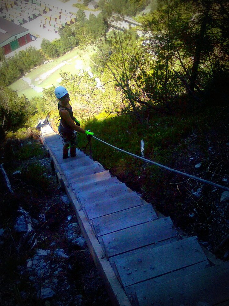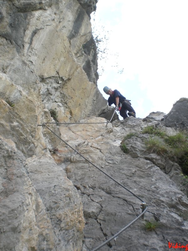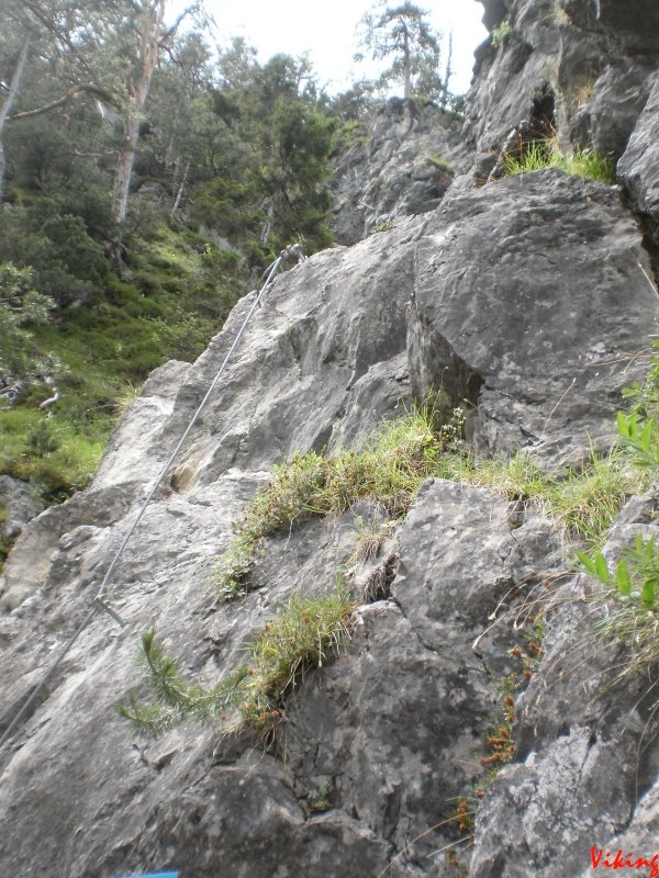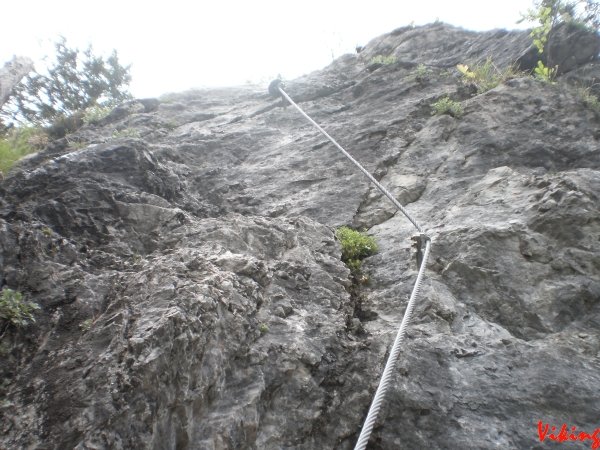 Vom Steigende immer entlang des Stahlseils tlw. über steiles, Gelände mit Holztreppe hinunter (bis B). Unten wird es steiler, im festen Fels kurz schwer (C/D) zum Ende des Seils. Auf Steigspuren zum Radweg absteigen.