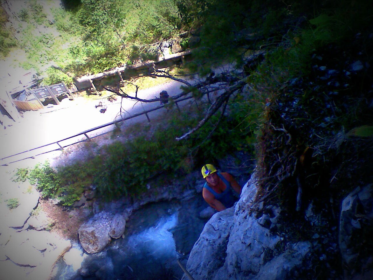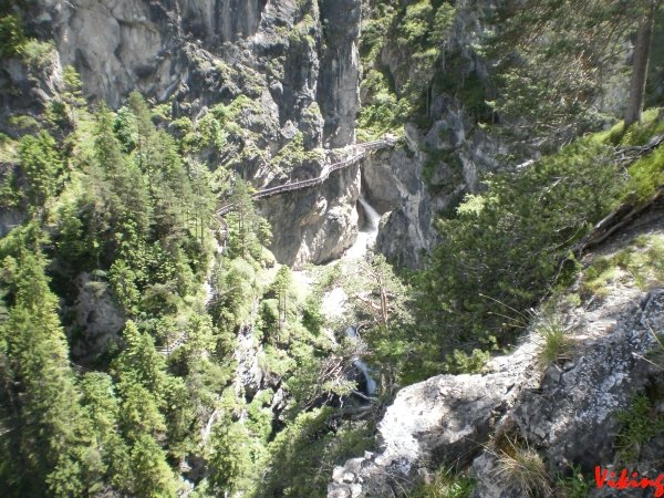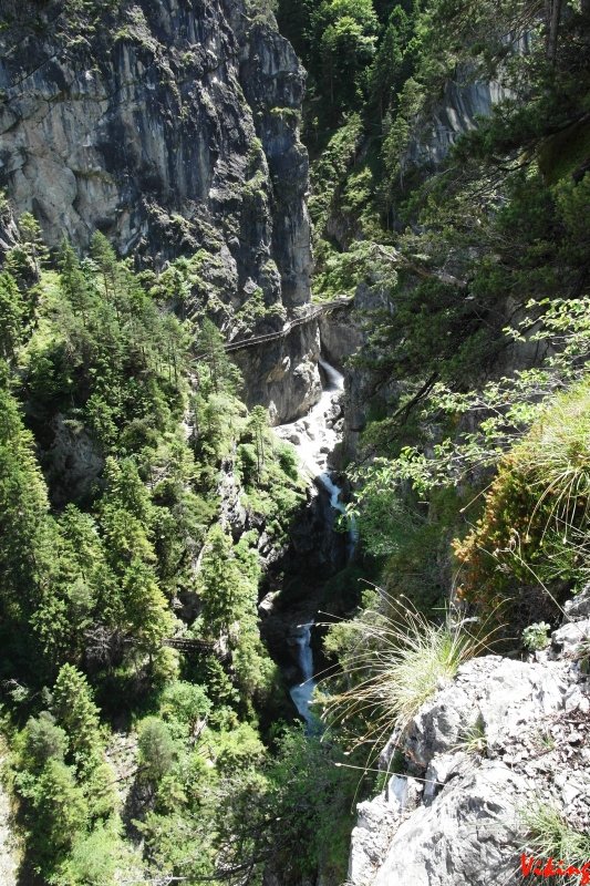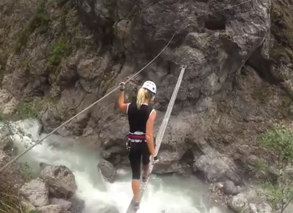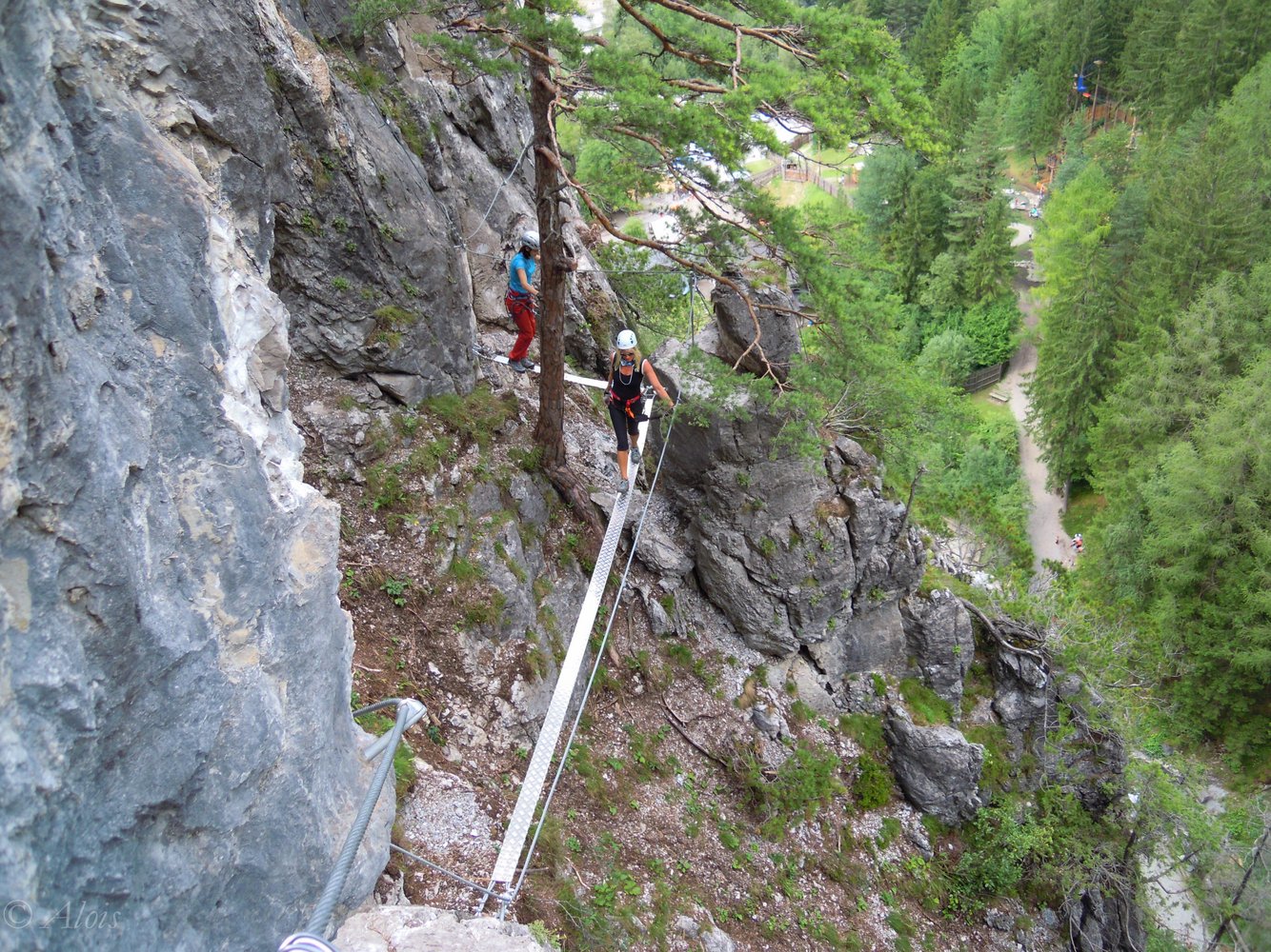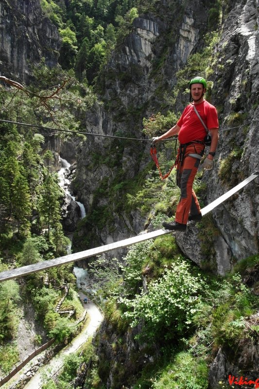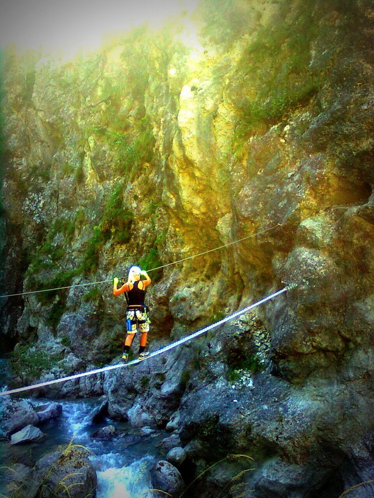 Nach der Kasse neben dem Galitzenbach in die Klamm, nach wenigen Metern gelangt man zur Alu-Seilbrücke (Einstieg).