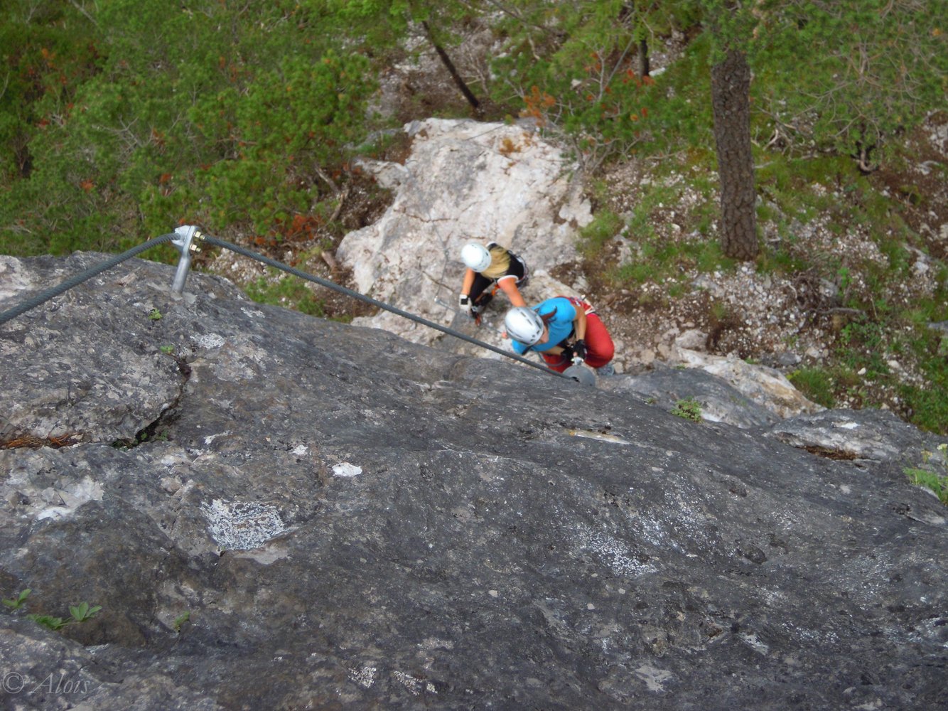 Leichte Variante: Nach zwei Alu-Seilbrücken auf eine Rampe (B), danach folgt eine glatte Verschneidung (D). Man quert weiter nach links (B/C) zu einer Stufe (C/D). Es folgt leichtes Gelände (B) zu einer glatten Kante (C/D), danach Plattenquerung zum Ende der Tour bei Wandbuch und Bankerl.