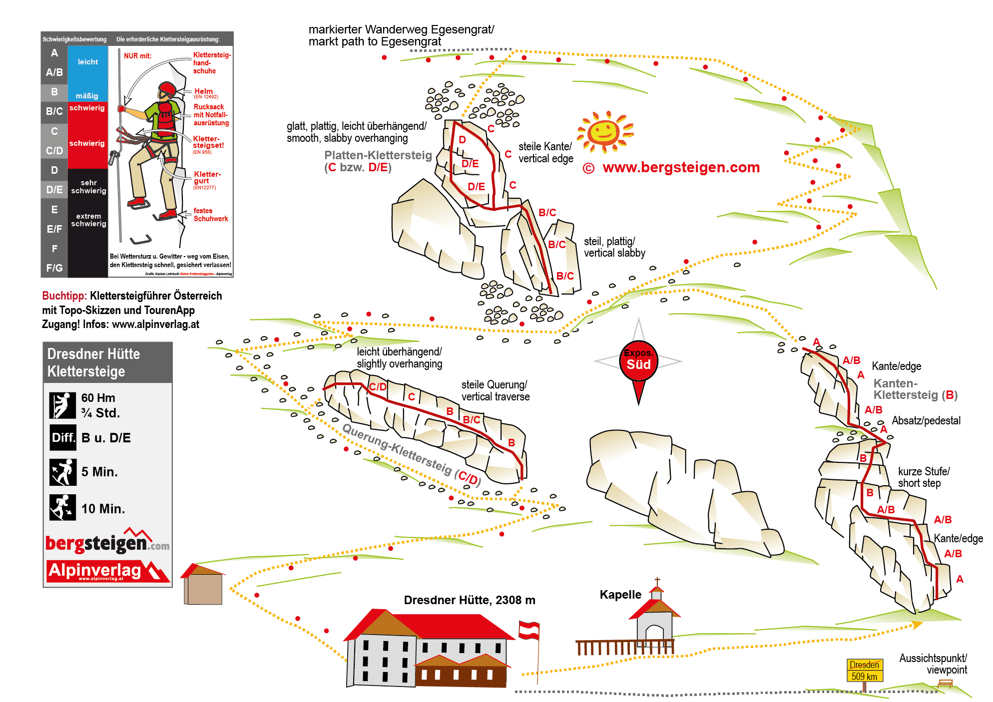 Von der Dresdner Hütte vor der Kapelle nach rechts zur Kante (B), nach der Kante steigt man links aufwärts zum Wanderweg und erreicht die Platte (C und D/E), danach rechts aufwärts zum Wanderweg, auf diesem absteigen. Man kommt direkt zur Querung (C/D).