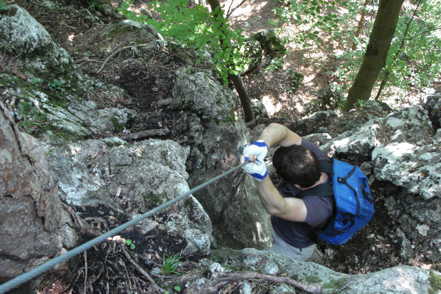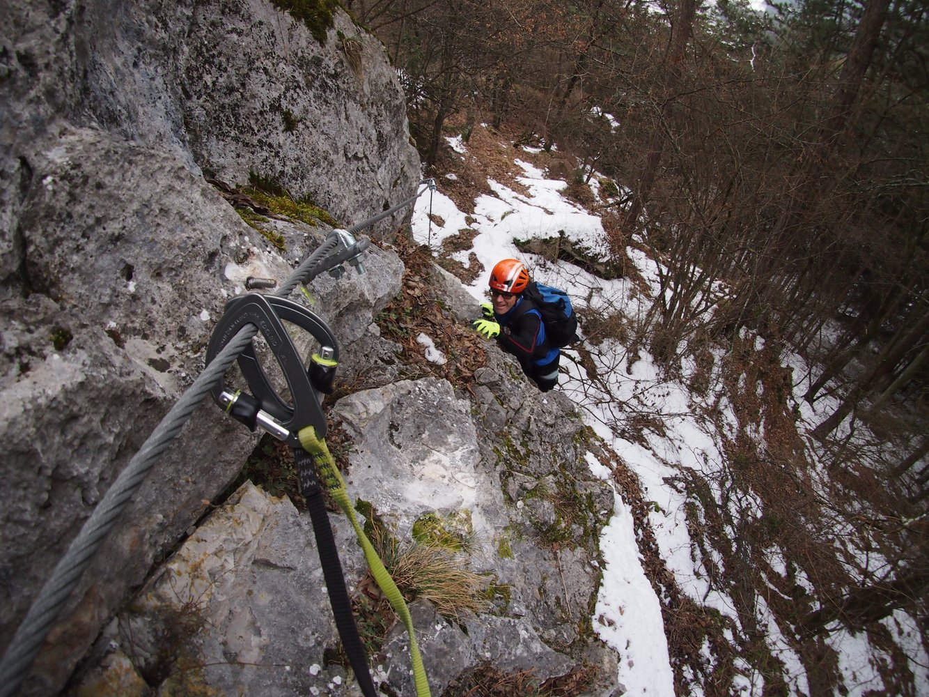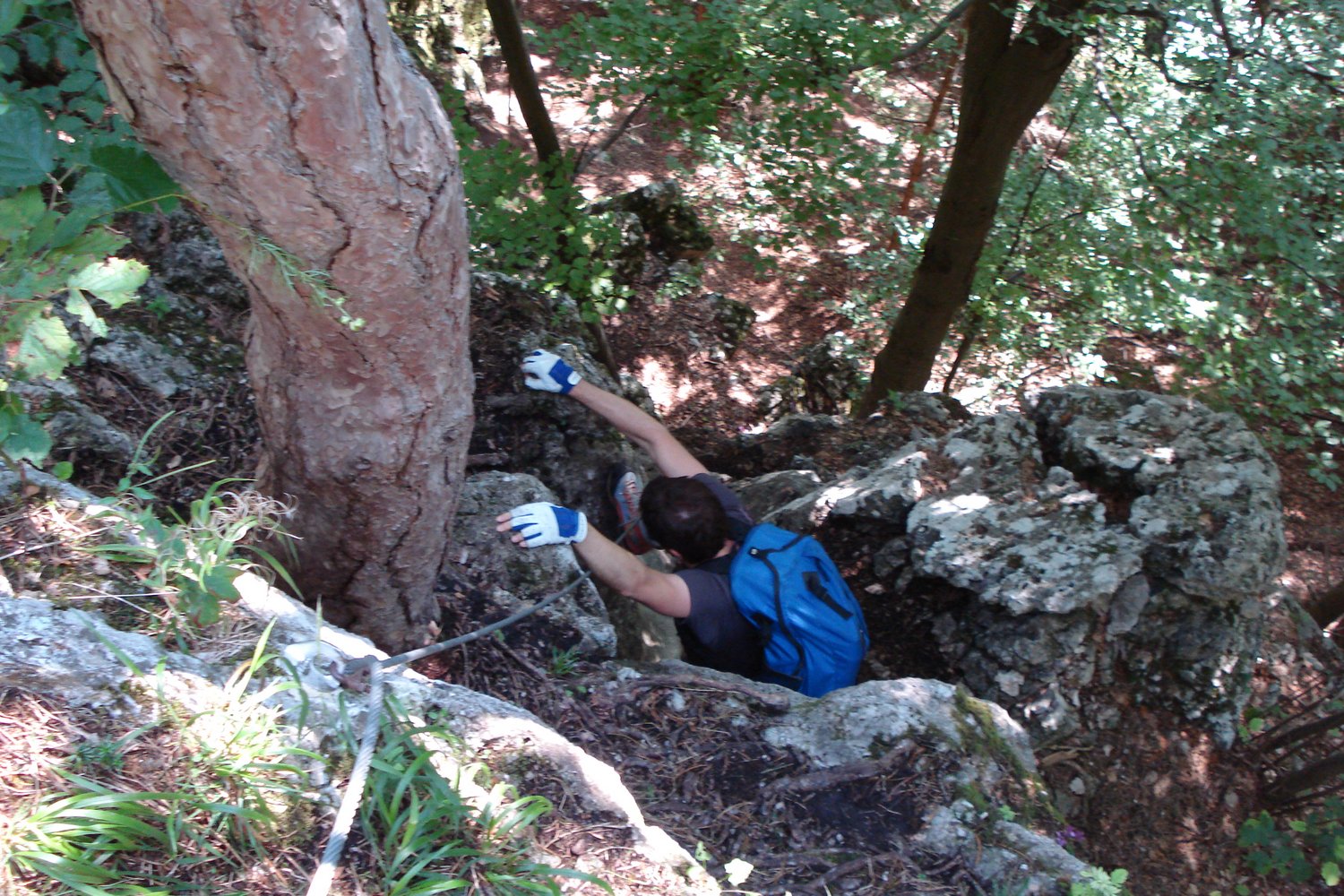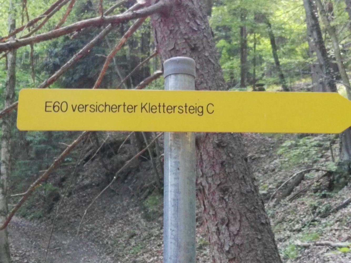 Nach der erdigen Einstiegswand (B/C) geht es über ein flacheres Stück (A/B) zu einem kleinen Absatz. Der nun folgende Überhang (C) stellt die Schlüsselstelle des ersten Abschnitts dar. Danach geht es leichter (zuerst A/B, dann A) ins Gehgelände. Dem Wegweiser folgend nach links über Steigspuren zum zweiten Abschnitt.