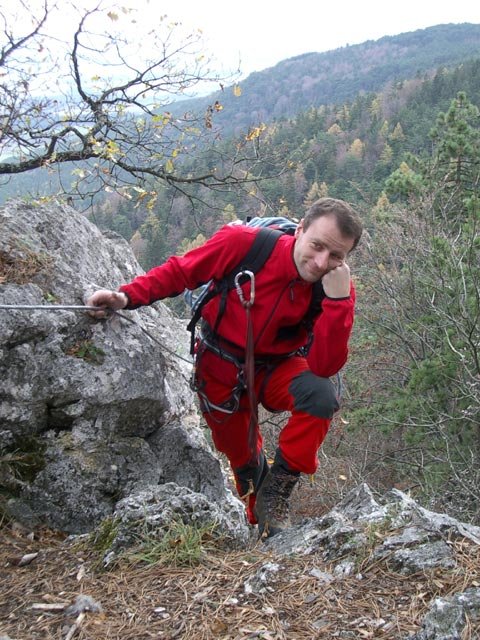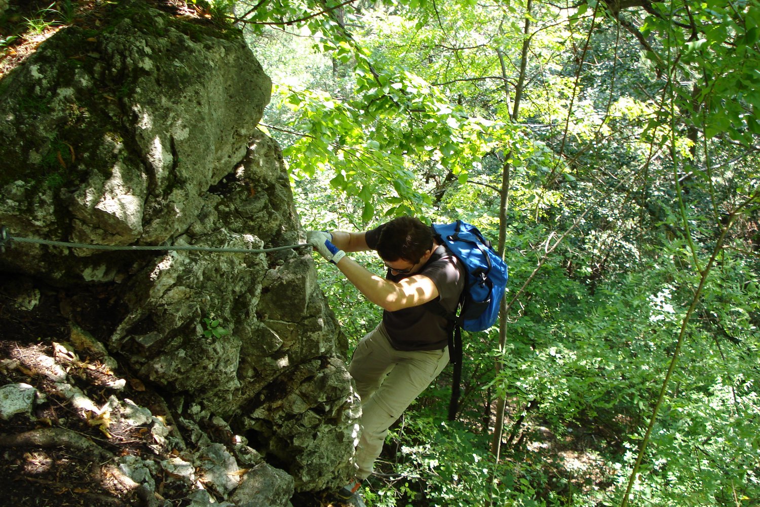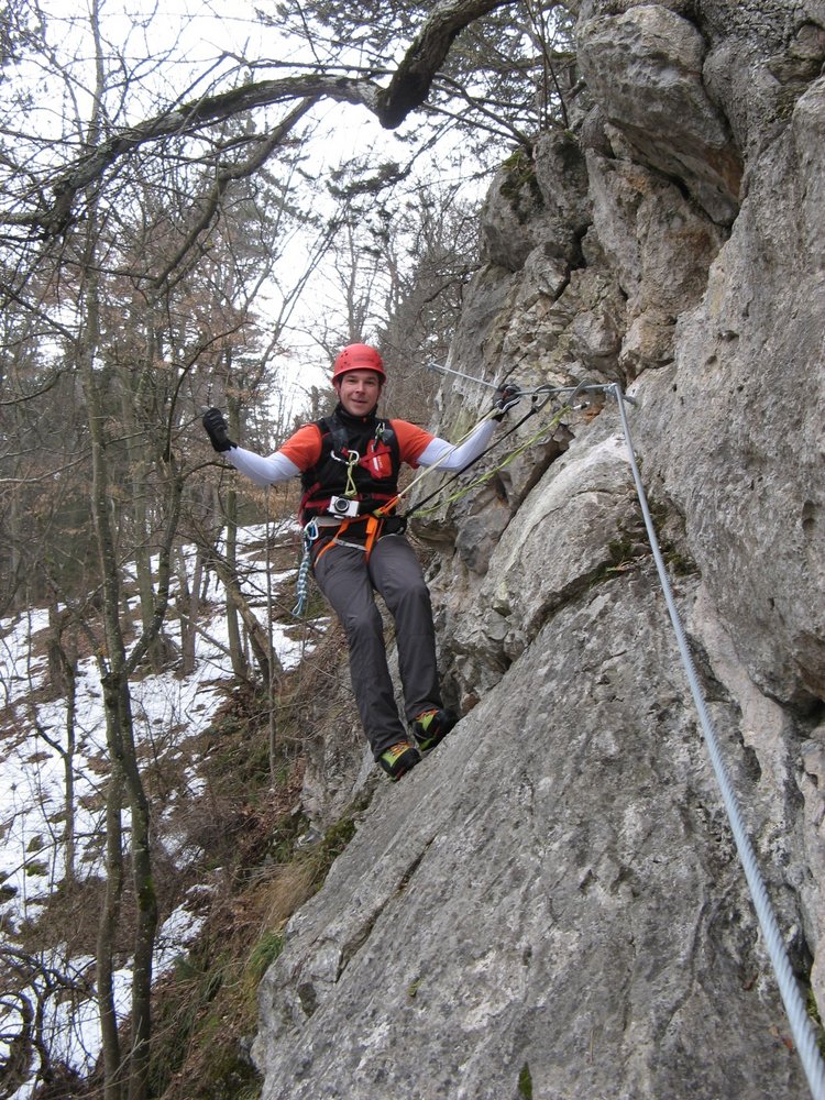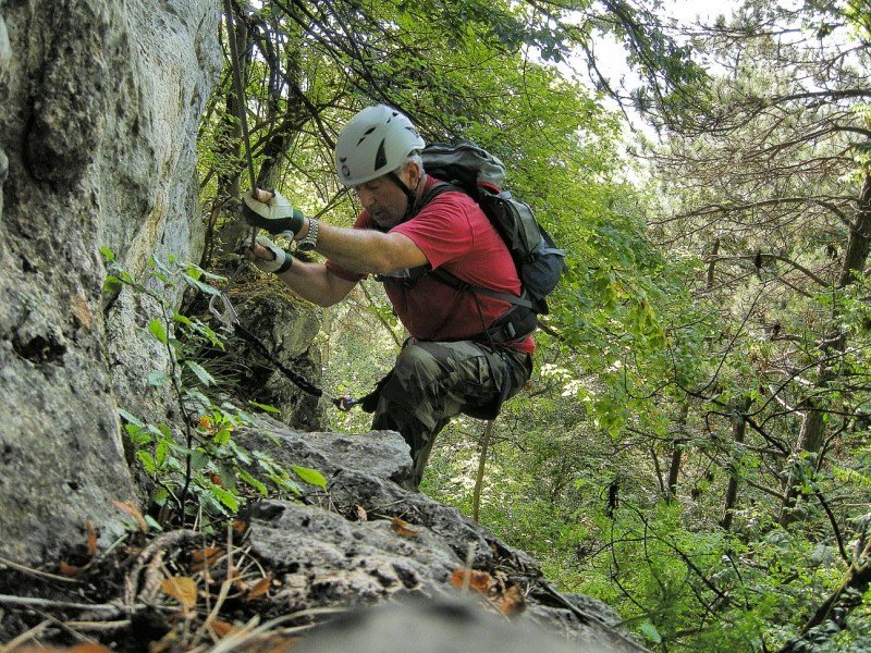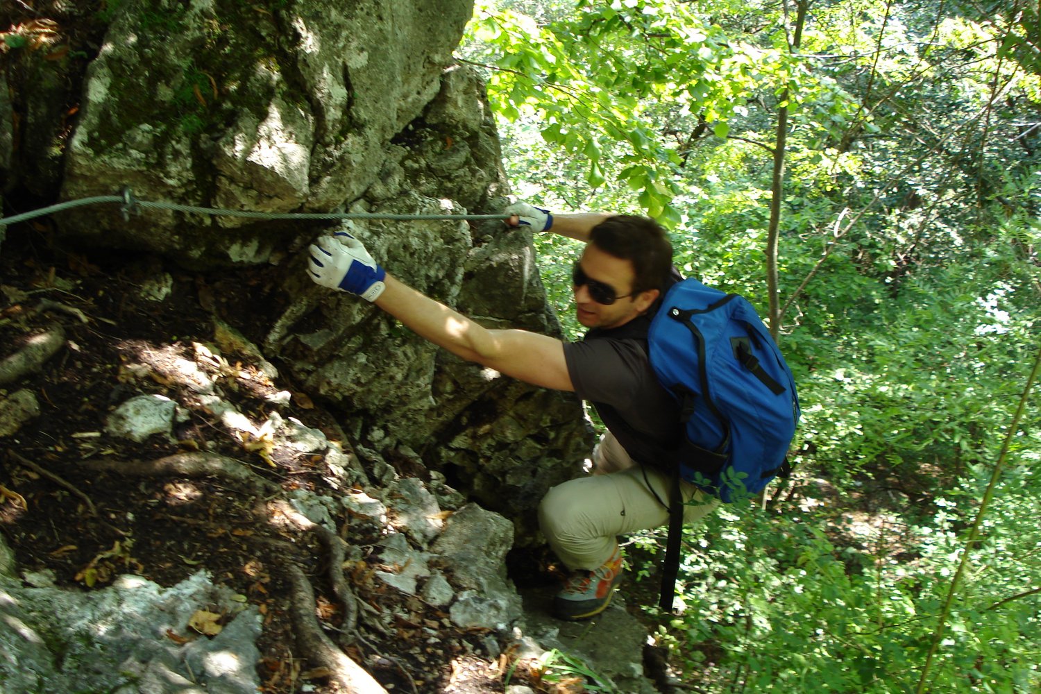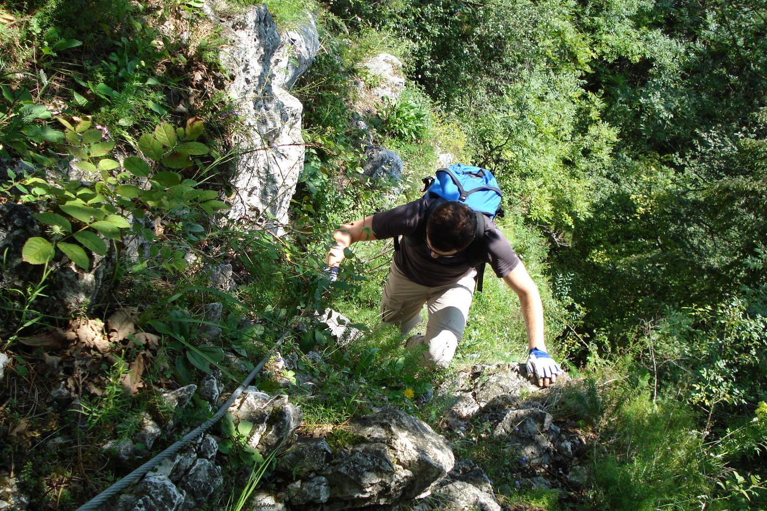 Nach der erdigen Einstiegswand (B/C) geht es über ein flacheres Stück (A/B) zu einem kleinen Absatz. Der nun folgende Überhang (C) stellt die Schlüsselstelle des ersten Abschnitts dar. Danach geht es leichter (zuerst A/B, dann A) ins Gehgelände. Dem Wegweiser folgend nach links über Steigspuren zum zweiten Abschnitt.