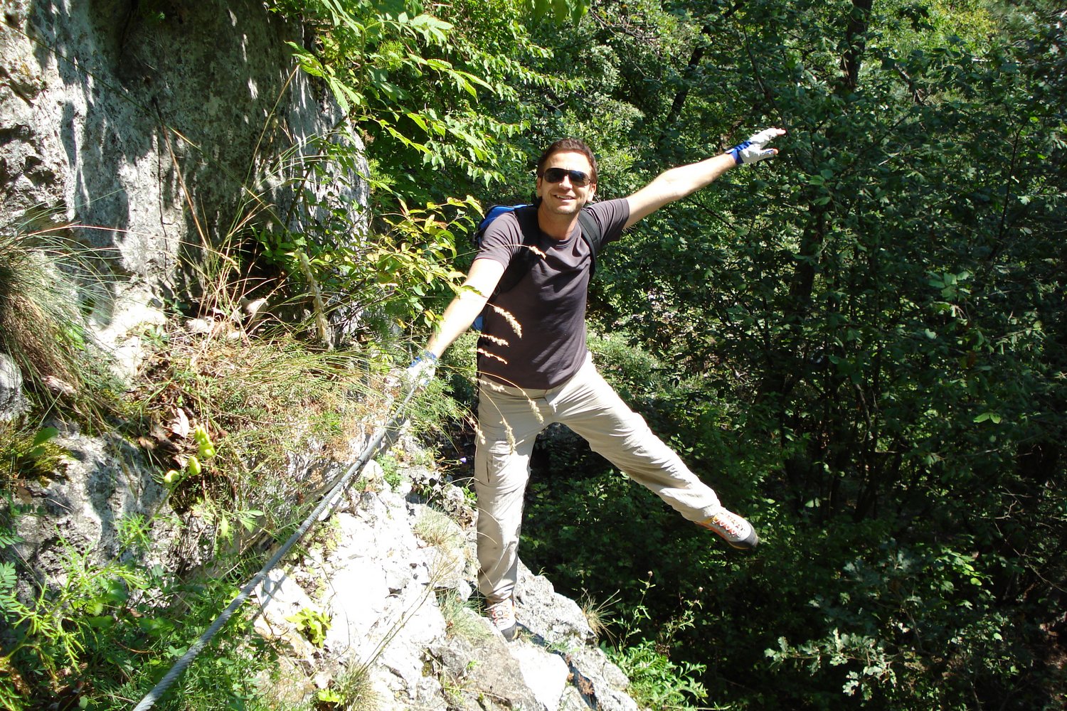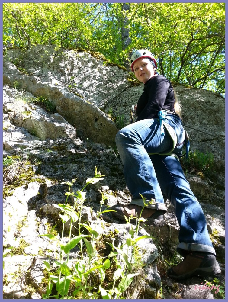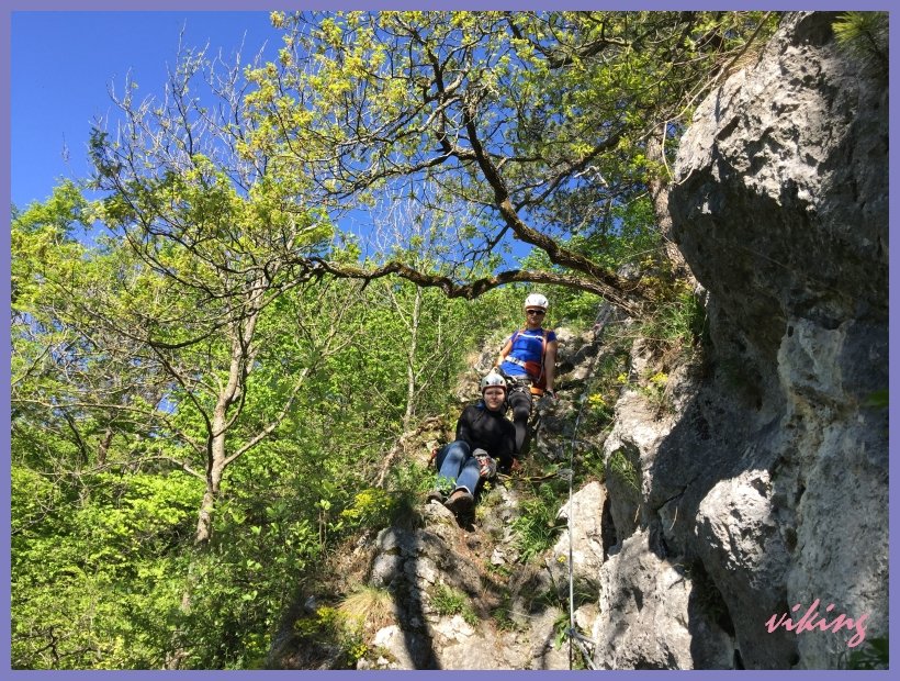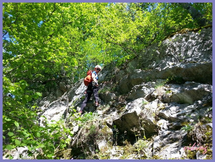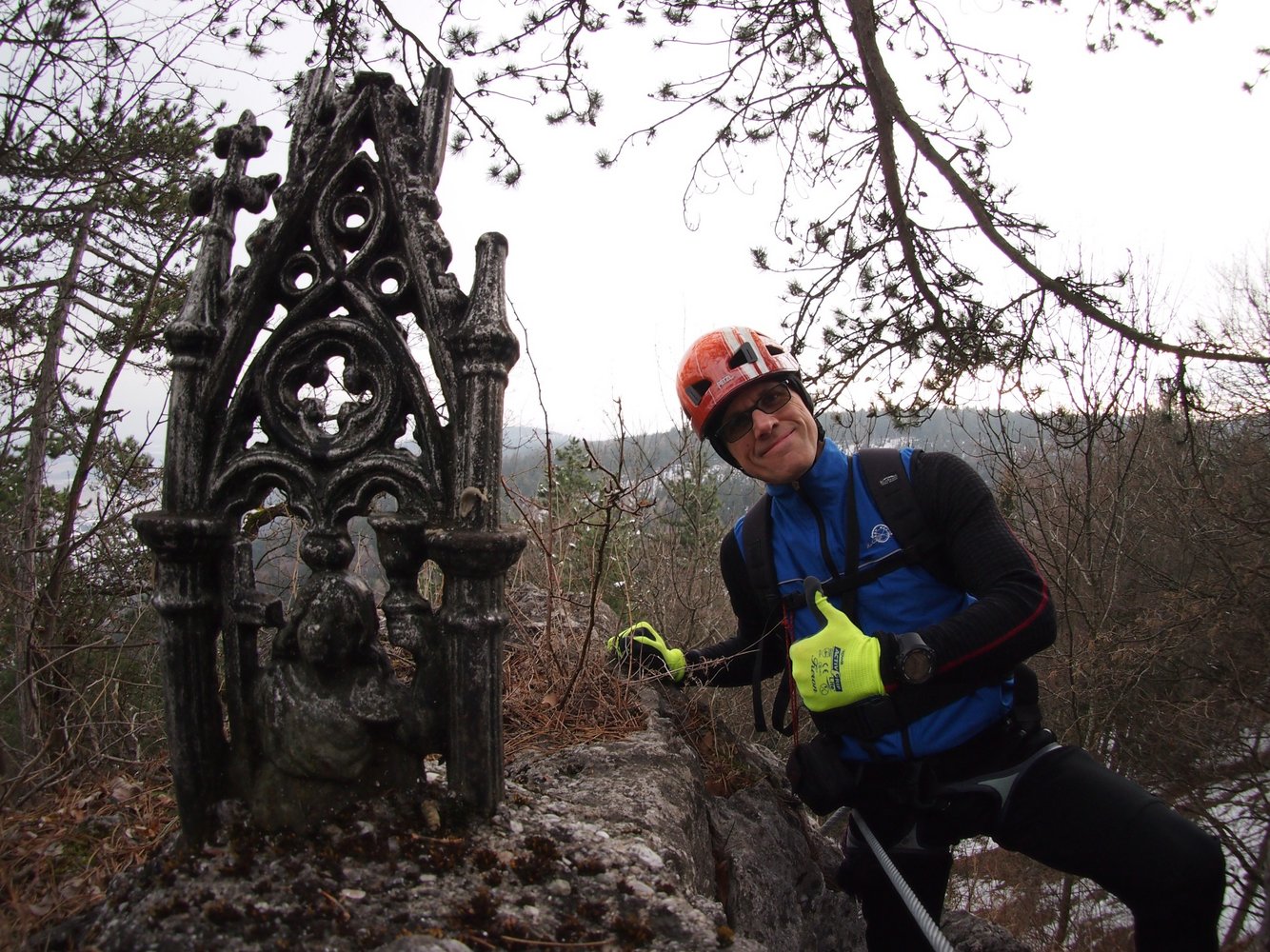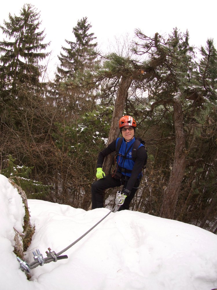 Nach der erdigen Einstiegswand (B/C) geht es über ein flacheres Stück (A/B) zu einem kleinen Absatz. Der nun folgende Überhang (C) stellt die Schlüsselstelle des ersten Abschnitts dar. Danach geht es leichter (zuerst A/B, dann A) ins Gehgelände. Dem Wegweiser folgend nach links über Steigspuren zum zweiten Abschnitt.