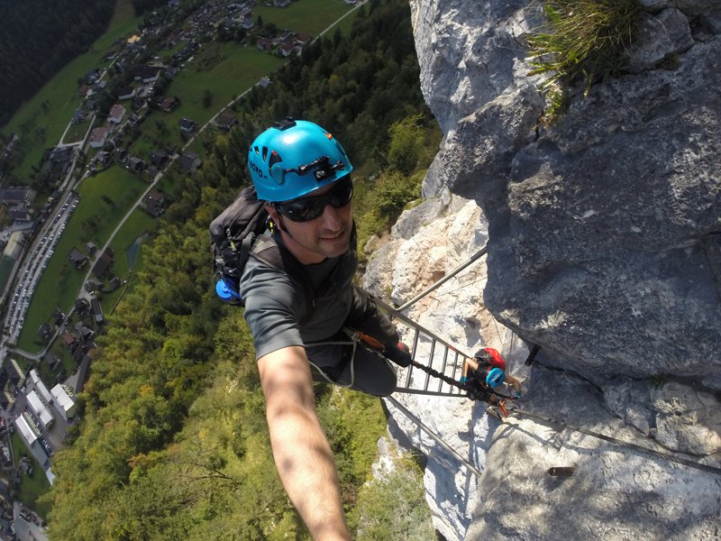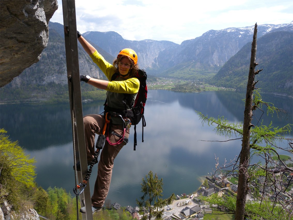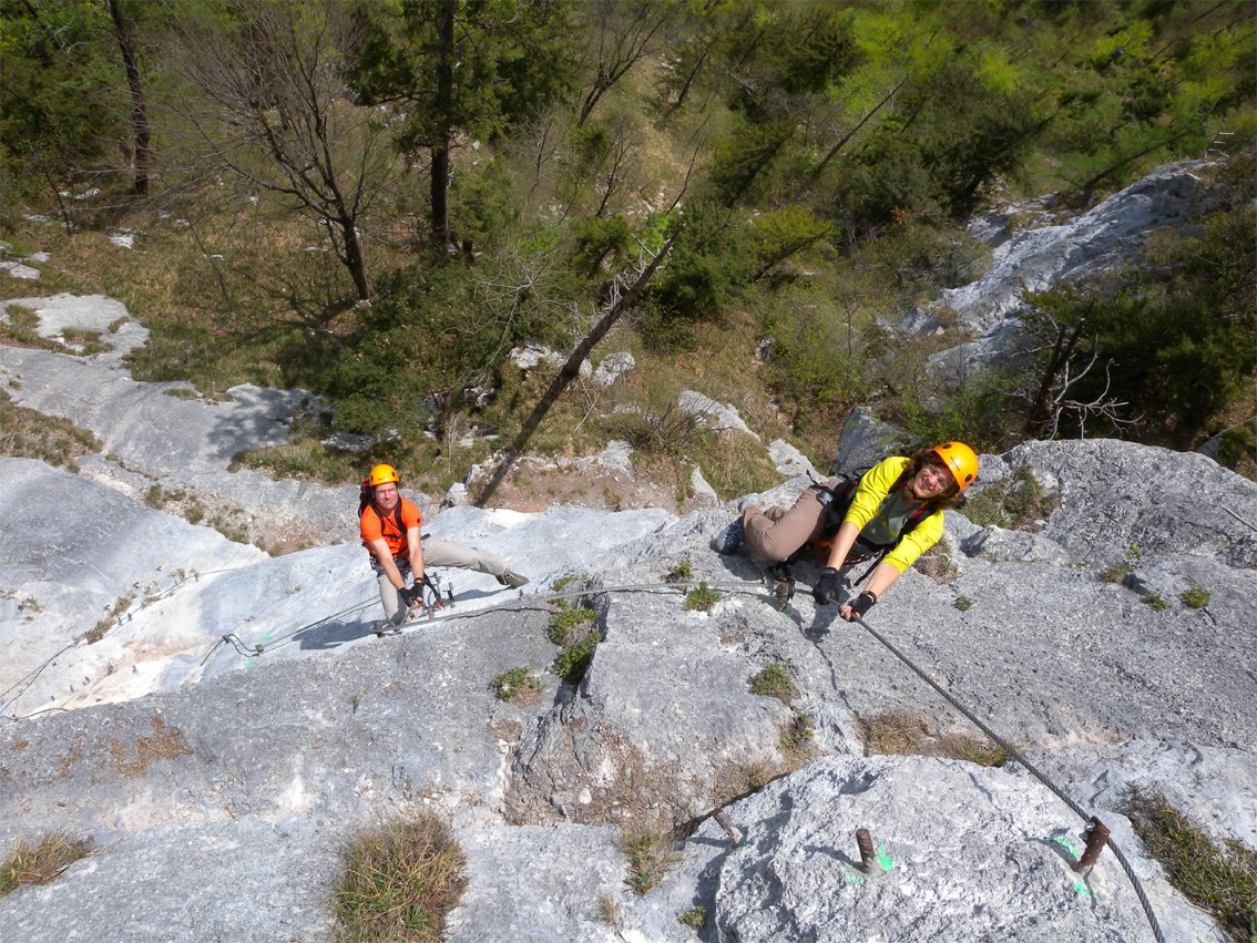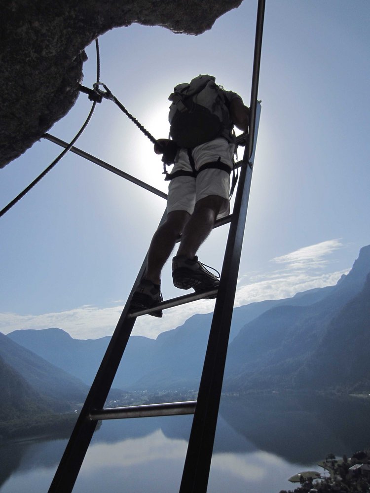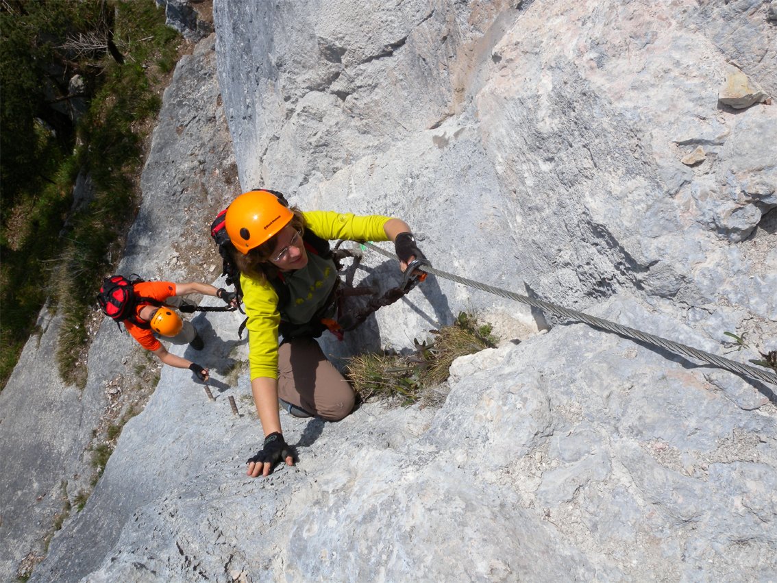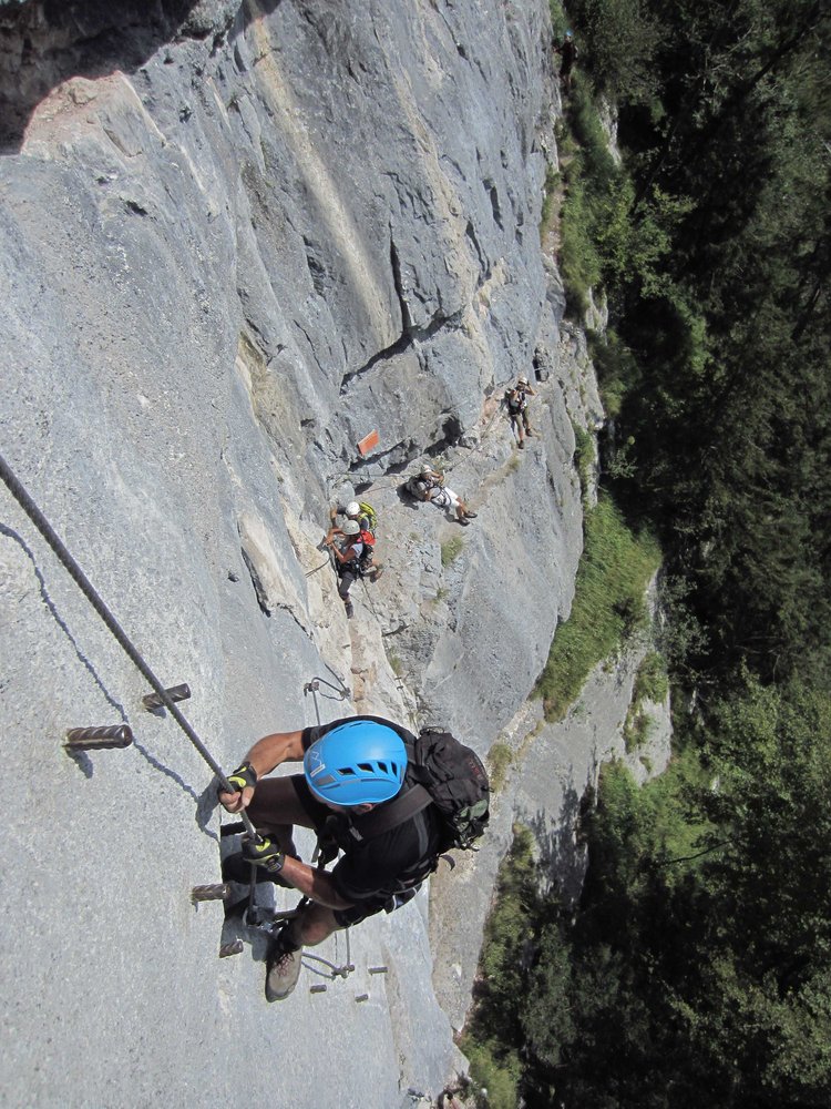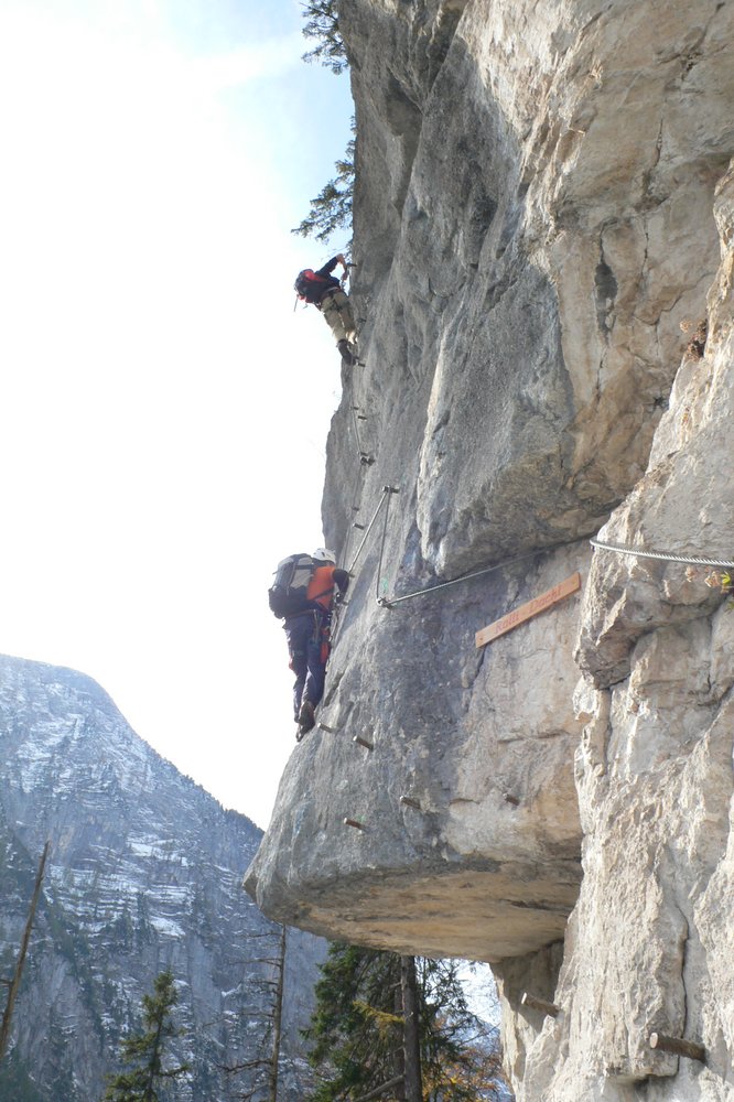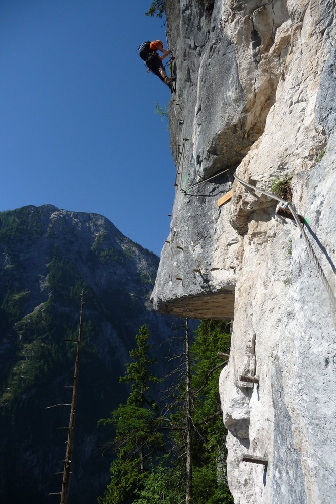 Wandstufe vor Panoramaleiter (C): klassische Dachstein-Trittstifte dominieren den Steig.,