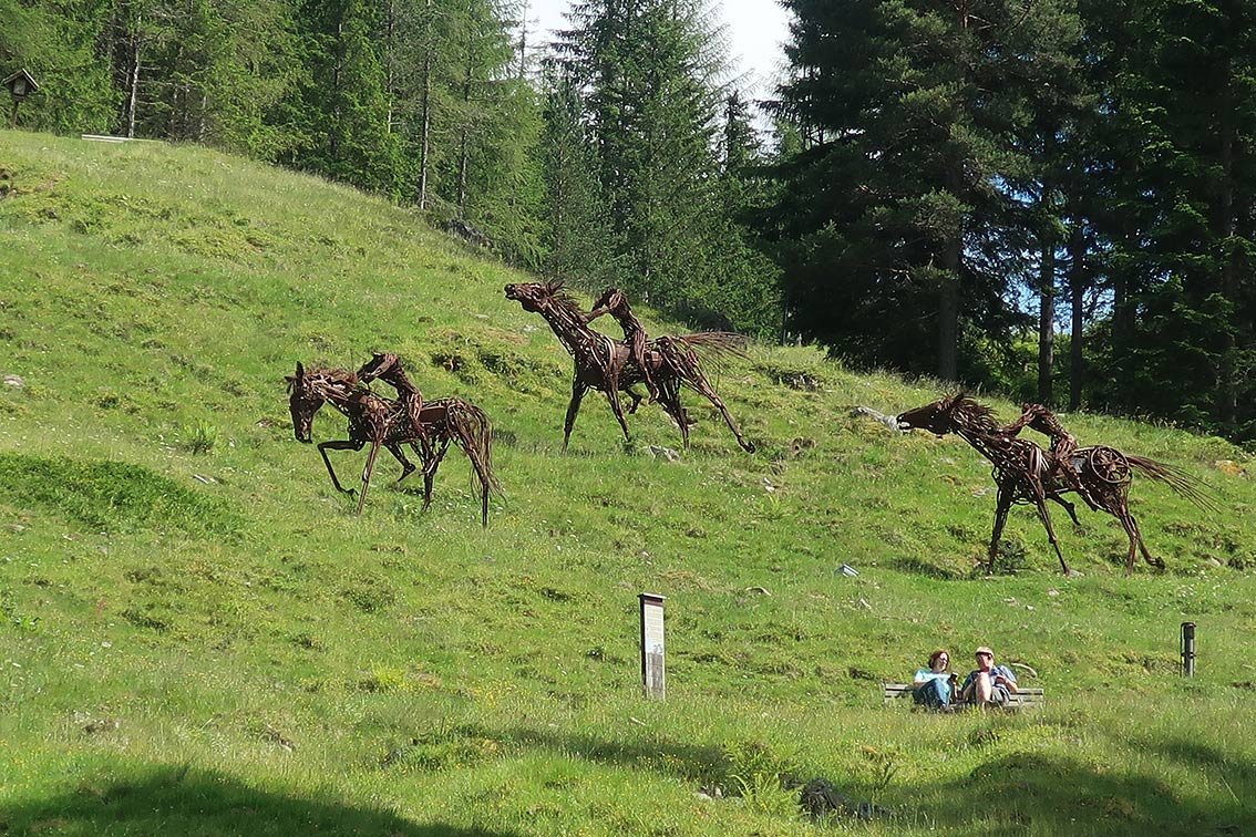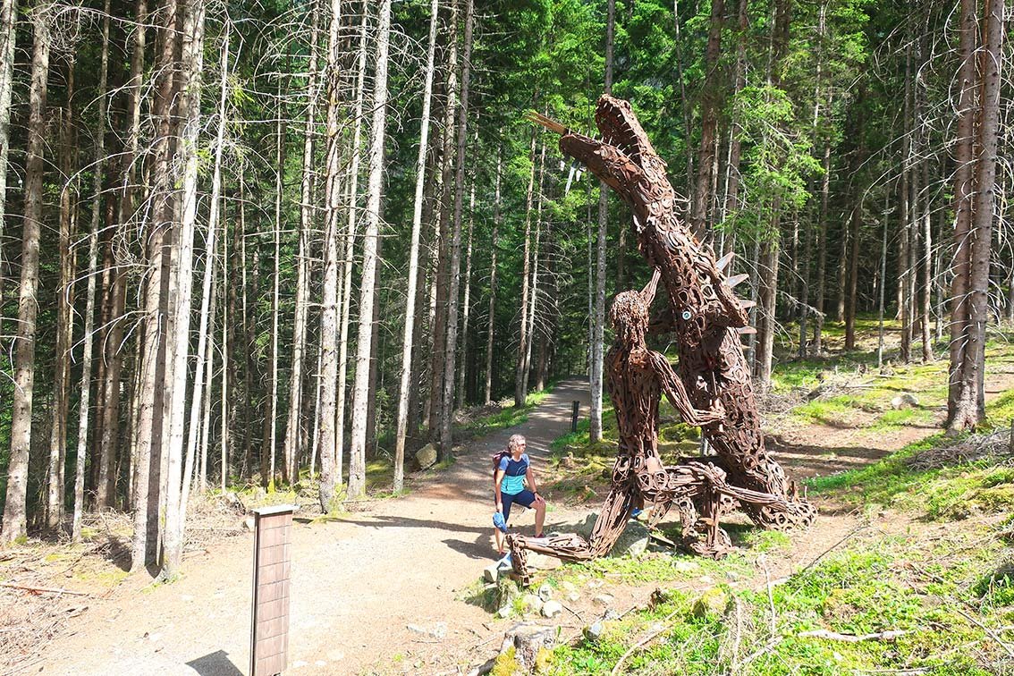 Tipp: Der Sagenweg ist ab der Dämmerung rötlich beleuchtet, da kommen die Eisenfiguren noch besser zur Geltung. Wenn man den Klettersteig am Nachmittag begeht, dann im Gasthof Feuerstein einkehrt und in der Dämmerung zurück zum Sportplatz absteigt, kann man sich das farbenfrohe Spektakel anschauen.