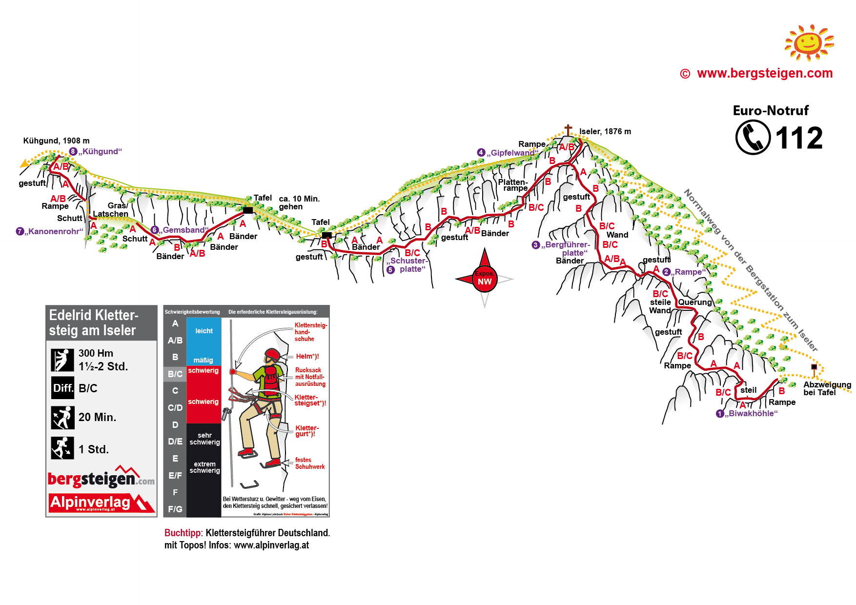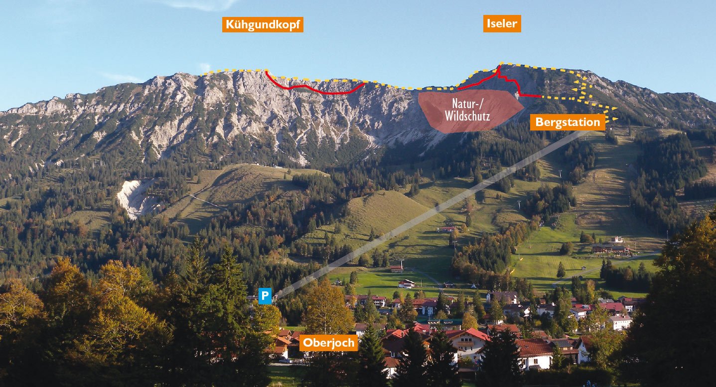 Über Bänder (A), Rampen (B, Stellen B/C) und kurze Steilstufen erreicht man die steile Bergführerplatte (B/C). Nach dieser wieder leichter (B) bis zur Abzweigung. Entweder gerade zum Iseler Gipfel hinauf (A/B; auf dem Gipfel trifft man auf den Wanderweg) oder links über eine Plattenrampe (B, Stelle B/C) auf ein Bandsystem, welches von der Schusterplatte (steilere, aber unspektakuläre Platte, B/C) unterbrochen wird. Am Ende steigt man steiler (B) auf den Wanderweg aus. Diesem folgt man ca. 10 Min. in Richtung Kühgund, um dann neuerlich seil gesichert (A, kurze Stelle B) abzusteigen. Auf dem Bandsystem erreicht man eine Graspassage, nach der man beim sog. „Kanonenrohr“ wieder auf die Seilsicherung trifft. Über Rampen (A/B) und gestuftes Gelände (A/B) zum Ausstieg.