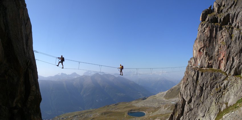 Ein Musterbeispiel für einen tollen Abenteuer-Klettersteig im Hochgebirge, für den jedoch keine besonders großen Anstrengungen nötig sind, ist der Eggishorn-Klettersteig. Mit der Seilbahn geht es bis auf 2869 m, wo man sich dem Panorama des Viertausender Aletschhorn, dem Großen Aletschgletscher sowie von Mönch und Jungfrau kaum entziehen kann. Der Große Aletschgletscher ist sowohl flächenmäßig als auch längenmäßig der größte Gletscher der Alpen. Von der Bergstation bis zum Einstieg des Klettersteiges sind es dann nur noch wenige Gehminuten. Der Klettersteig selbst wartet mit mehreren unterschiedlich konstruierten und spektakulären Hängebrücken auf, von welchen die Längste 40 adrenalinerfüllte Meter verspricht. Der Höhepunkt ist aber die spaßige Tyrolienne (Flying Fox) - diese kann allerdings nur in Begleitung eines Bergführers benutzt werden. Dieser Klettersteig eignet sich nicht nur für erfahrene Klettersteiggeher, sondern auch für mutige Anfänger und Kinder, da man die Seilbrücke zu Fuß umgehen kann. Zusätzlich sorgt ein Notausstieg für Sicherheit.