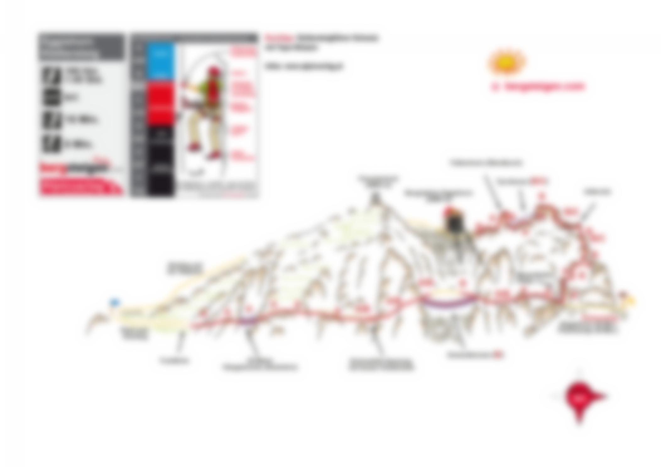 Vom Einstieg über die Querung „Fuxfährte“ (A) zur ersten, 30 Meter langen Hängebrücke (eine „Leiternbrücke“, A). Es folgen die sogenannte „Schneefi nk-Querung“ (A/B) und ein kurzer Aufschwung (A/B). Die zweite, 40 Meter lange Hängebrücke (eine 3-Seil-Brücke, B) kann umgangen werden (B). Nach dem „Gemstritt“ (A/B) geht es über eine leichte Querung (A) zur Mauerläufer-Platte (B), an deren Beginn sich ein Notausstieg befi ndet (über Notausstieg jeweils ¾ Std. zur Berg- oder Mittelstation). Über mehrere Aufschwünge (A bis B/C) erreicht man den „Adlersitz“ (B/C) und die Tyrolienne (B/C), welche ebenfalls umgangen werden kann (B). Den Abschluss bildet der zerklüftete Falkenturm (A bis B) mit einer kurzen Hängebrücke.