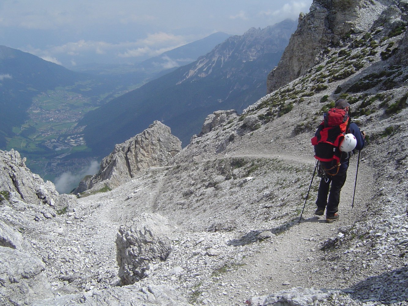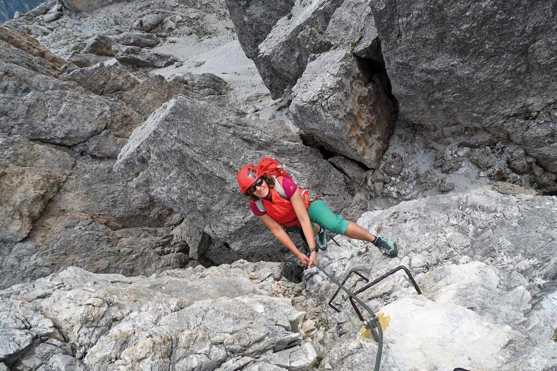 Komplette Klettersteigausrüstung, Helm (Vorsicht: Steinschlag bei der Schluchtquerung) und unbedingt Sicherungsseil für schwächere Geher und Kinder. Klettersteighandschuhe sind von Vorteil!