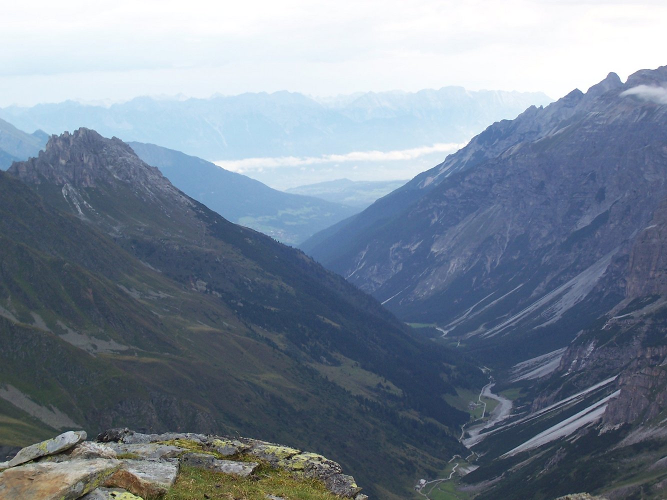 Vom Steigende zum Zwölfnieder-Sattel absteigen und auf dem Panoramaweg zurück zur Bergstation (fast eben, schöner Ausblick auf das Pinnistal und die Bergwelt dahinter)