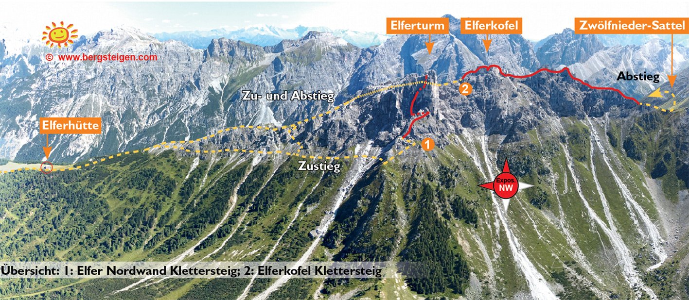 Von der Bergstation folgt man dem Weg zur Elferhütte und steigt von dieser zu den Elfertürmen auf (am Ende Blockgelände, tlw. versichert). In einer Scharte östlich der Elfertürme befindet sich der Einstieg an der Felskante. Alternativ kann auch über den Nordwand-Klettersteig zugestiegen werden.