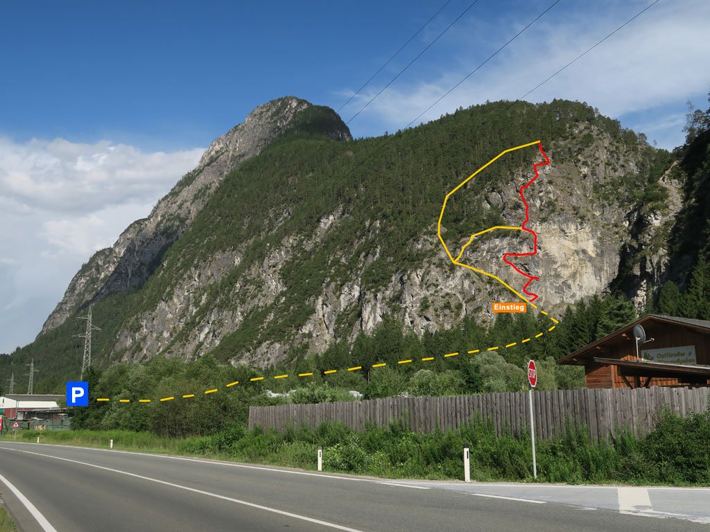 Vom Einstieg in gestuftem Gelände (B bis C) zu einem Rastplatz. Nun über eine Platte (B/C) und einen kleinen Überhang (C) zu einer leichten Querung (A bis B). Eine ausgesetzte, aber leichte Leiter (A/B) und eine Kante (B) führen zum Notausstieg. Über die steile Schlüsselstelle (C/D) in gestuftes Gelände (B bis C) und zur Alubrücke (A/B). Es folgt nochmals gestuftes Gelände (A/B bis B) bis zum Ausstieg (A).