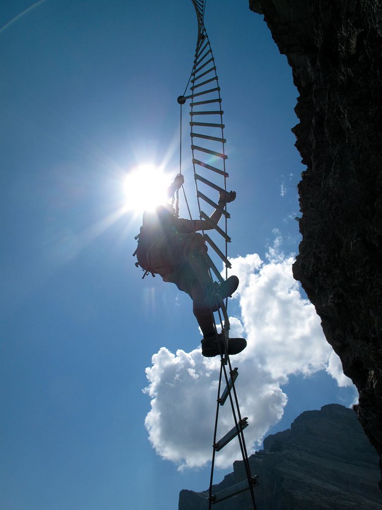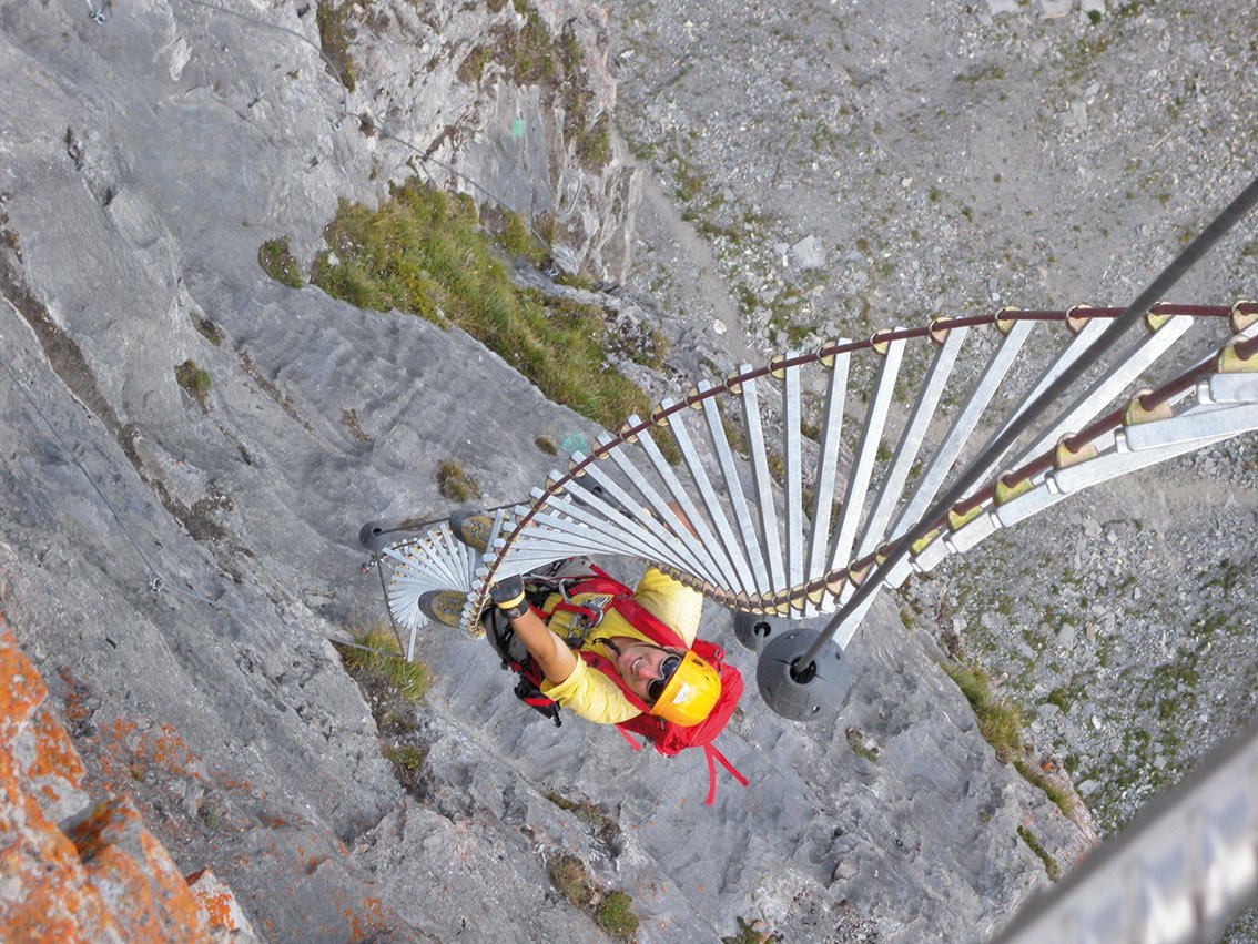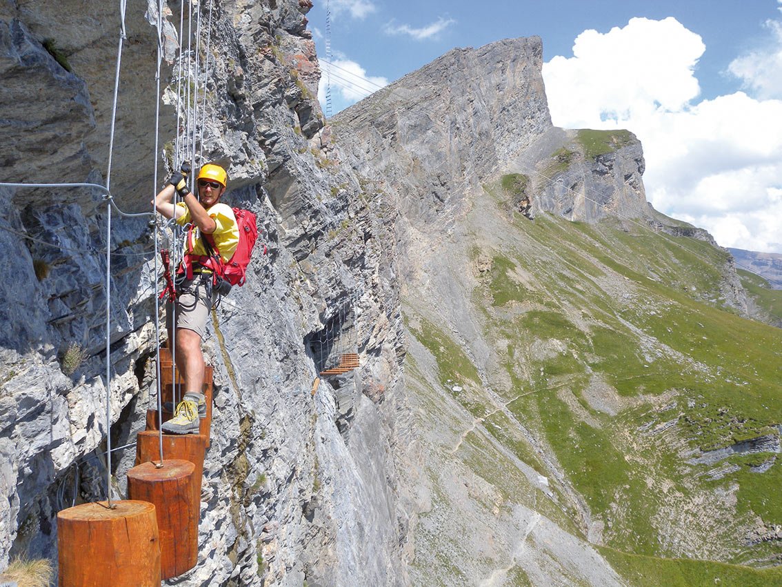 Die spinnen die Schweizer, denkt man vielleicht im ersten Moment, wenn man die wilden, einem Hochseilpark ähnlichen Konstruktionen an der Felswand sieht. Doch schon bei der ersten „Übung“ merkt man, wie aufregend das ist, wenn man auf wackelnden Holzbalken oder an der 540°-Leiter über dem tiefen Abgrund turnt. Der Fun-Klettersteig setzt neue Maßstäbe in Sachen Klettersteigbau und sorgt deshalb bei einigen alten Klettersteig-Gurus für Kopfschütteln. Die jungen Outdoorfreaks, welche das „unkomplizierte“ Abenteuer mit Thrill und dem ultimativen Kick suchen, werden den Gemmi Klettersteig mit offenen Armen aufnehmen. Schon von der Gondel aus sieht man mit etwas Glück einige Gestalten an der Wand entlang turnen, nach wenigen Schritten kann man selber ins Geschehen eingreifen. Was will man noch mehr? Die ganze Kletteranlage ist noch dazu verpackt in eine Bilderbuch-Bergwelt - dieses Gesamtpaket ist fast nicht zu topen.