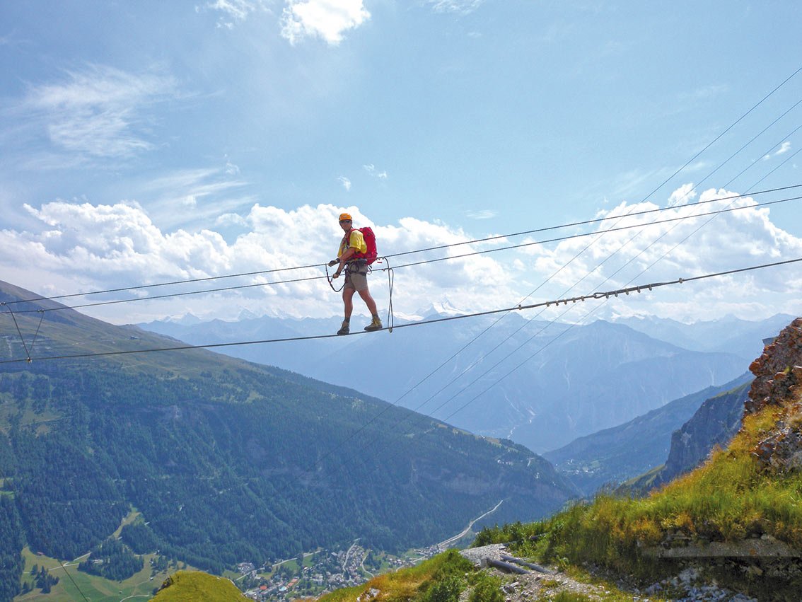Trotz der Nähe zur Seilbahn sollte der Klettersteig nicht unterschätzt werden - nicht jeder fühlt sich bei den wackeligen Übungen wohl. Je nach Geschicklichkeit und Balancegefühl braucht man mehr oder weniger Kraft. Der Erlebnisklettersteig Gemmiwand und der Daubenhorn-Klettersteig wurden vom Verein IG Klettersteig gebaut.