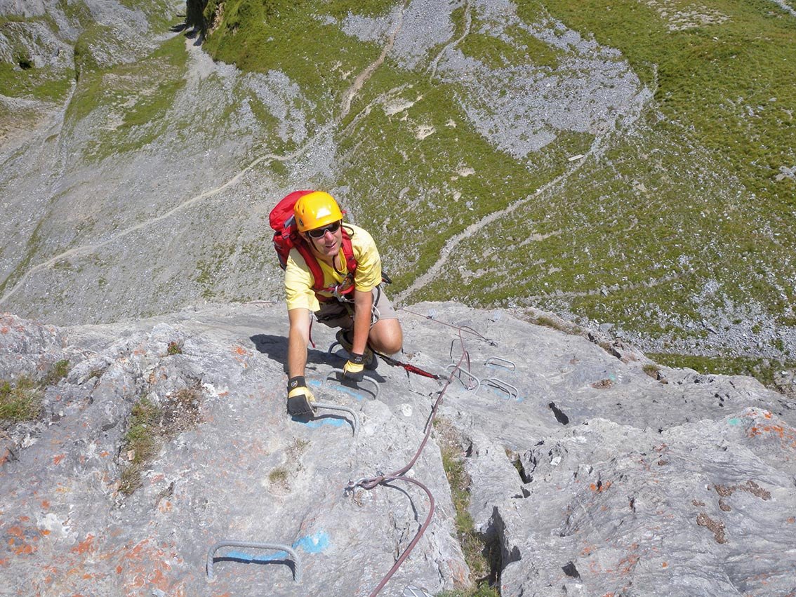 Siehe Topo - die Hauptschwierigkeit des Gemmi Klettersteig im Teil 1 (D) ist eine Passage nach dem Trapez (D). Teil 2 (C/D): Die Querung (C/D) nach der Leiter und der letzte Aufschwung (C/D) sind schwer. Die Schwierigkeit der „Freien Leiter“ kann man verstellen.