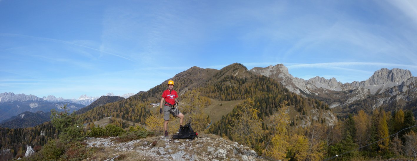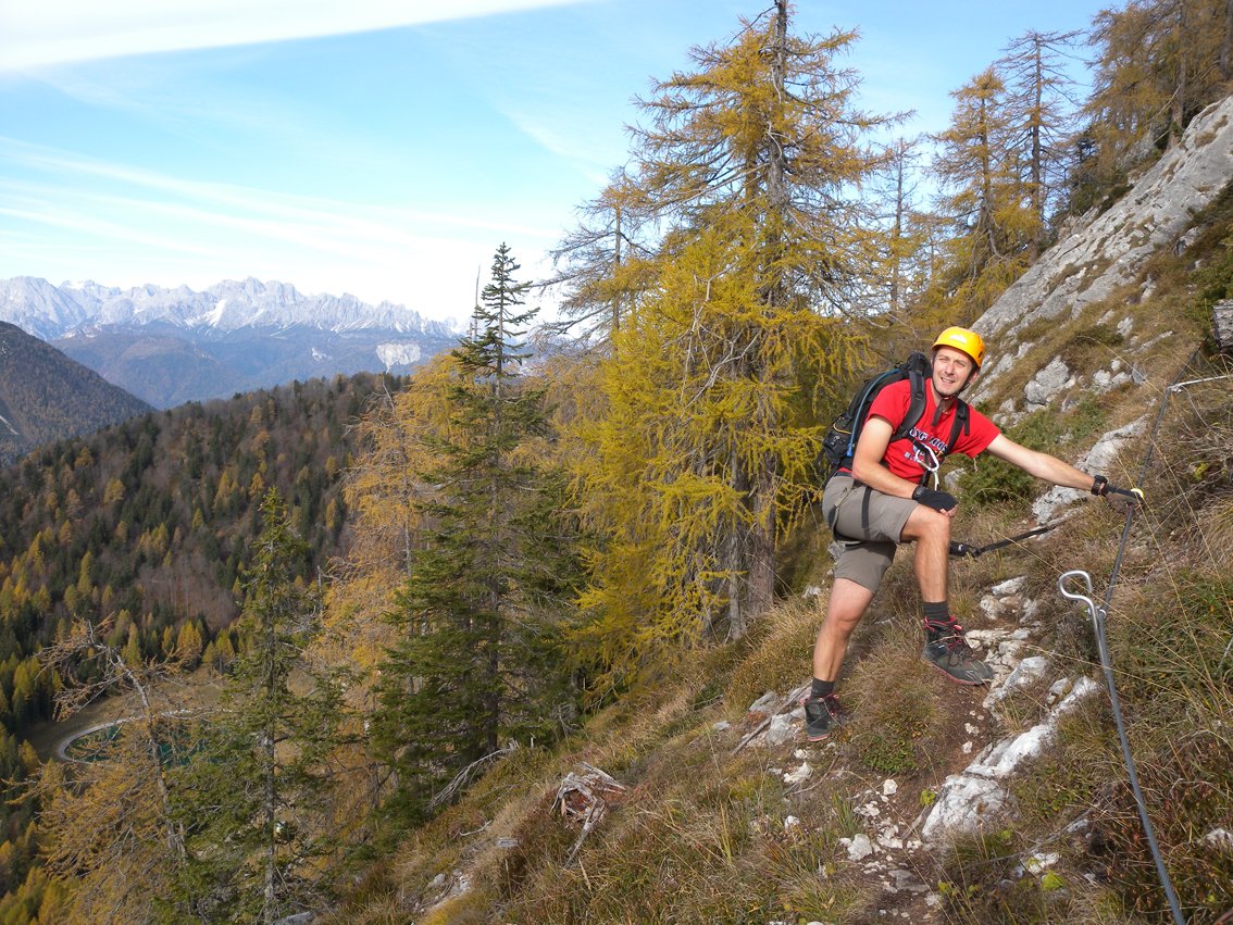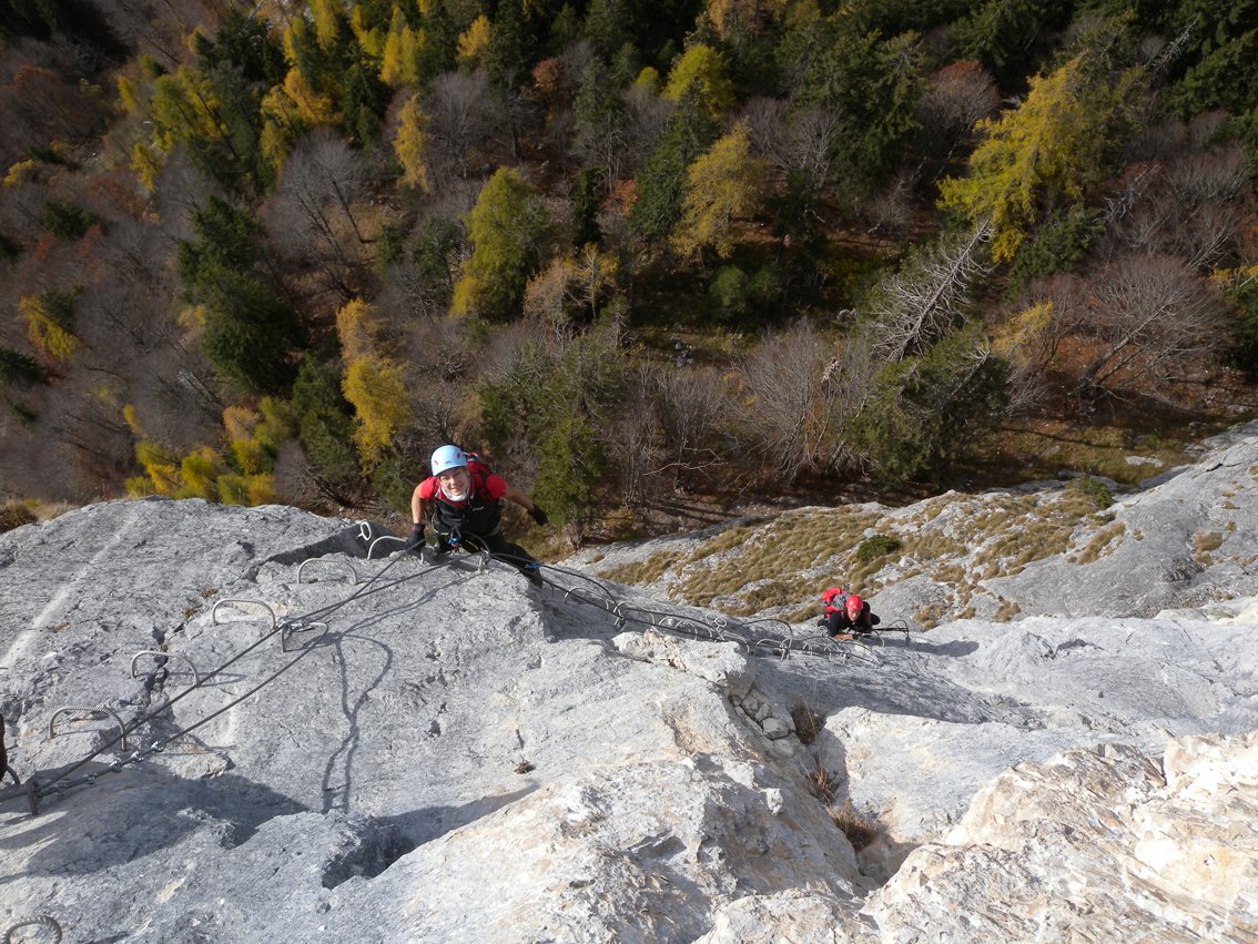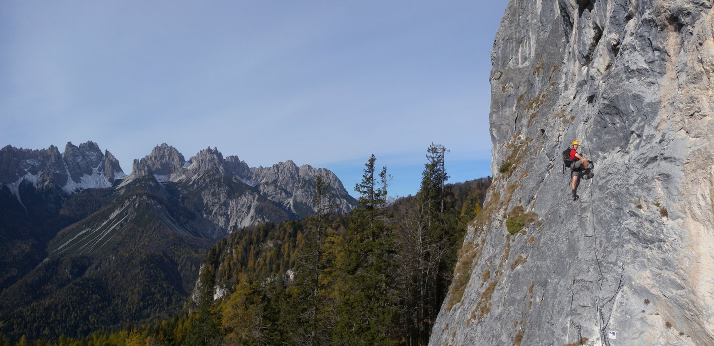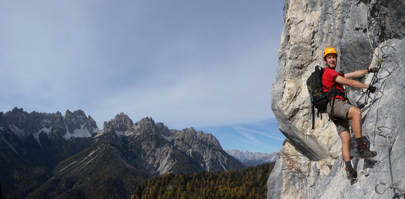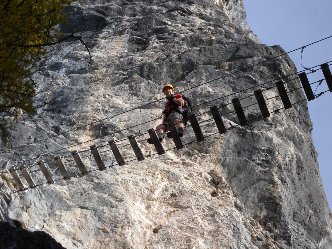 Ein Sportklettersteig wie aus dem Bilderbuch - besser hätte man eine sportliche Ferrata nicht anlegen können! Der 300 m lange Steig hat - wenn man den Sessellift nimmt - einen kurzen Zustieg, dann einen leichten Actionteil mit einem Spalt, einer Spannleiter und einer 30 m hohen Hängebrücke. Danach folgt das furiose Vertikalfinale durch die senkrechte Steilwand. Die Tour ist mit C/D (eine Stelle D) nicht allzu schwer, etwas Kraftausdauer sollte man aber schon haben, damit man an der lange Steilwand auch die perfekte Aussicht auf die Felstürme der Dolomiti d’Oltre Piave genießen kann.