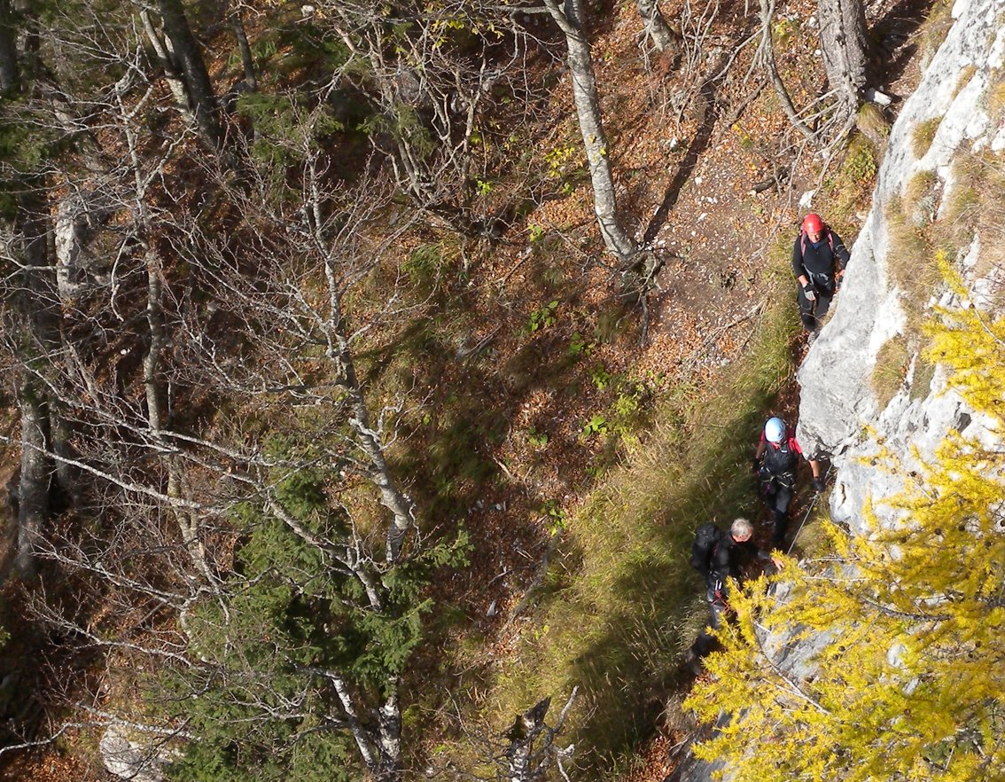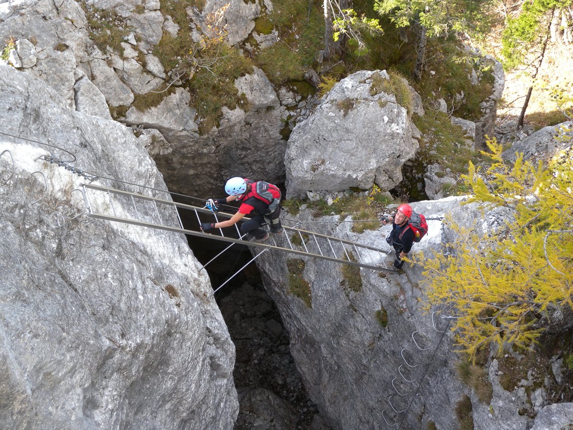 Komplette Klettersteigausrüstung und Helm - für Schwächere ist ein Sicherungsseil sinnvoll.