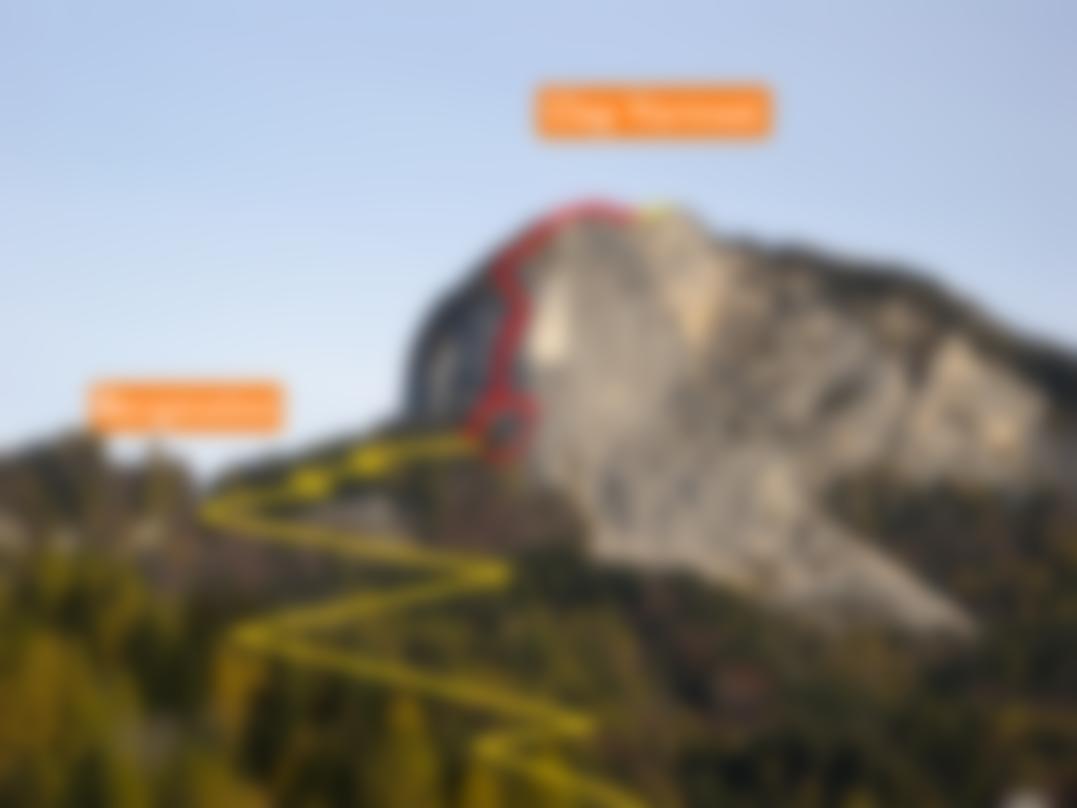 Siehe Topo. Vom Einstieg nicht gerade die Stahlseile hinauf (das ist der Notabstieg)! Man geht nach rechts, steigt zu einem Holzbrett ab (A/B) bei einem engen Spalt (A). Links an Klammern (B) aufwärts zur ersten Leiter (A/B), dann an Klammern (B) auf einen Turm (Aussichtspunkt). Von dort über die Hängebrücke (A/B) zur Hauptwand und mithilfe von Klammern (B) auf ein Band, dann nach links (B) bis zum Beginn der Gipfelwand. Die Gipfelwand ist durchgehend steil (C/D) und verlangt Ausdauerkraft. Nach einer Platte (B/C) kommt eine kurze Steilstufe (D). Nach einer weiteren Platte (B/C) und einer steilen Klammernpassage (C/D) ist das Ende der Schwierigkeiten erreicht. Gestuft (Stellen bis A/B) folgt man dem Stahlseil bis kurz vor das Gipfelkreuz (unbedingt beim Seil bleiben!).
