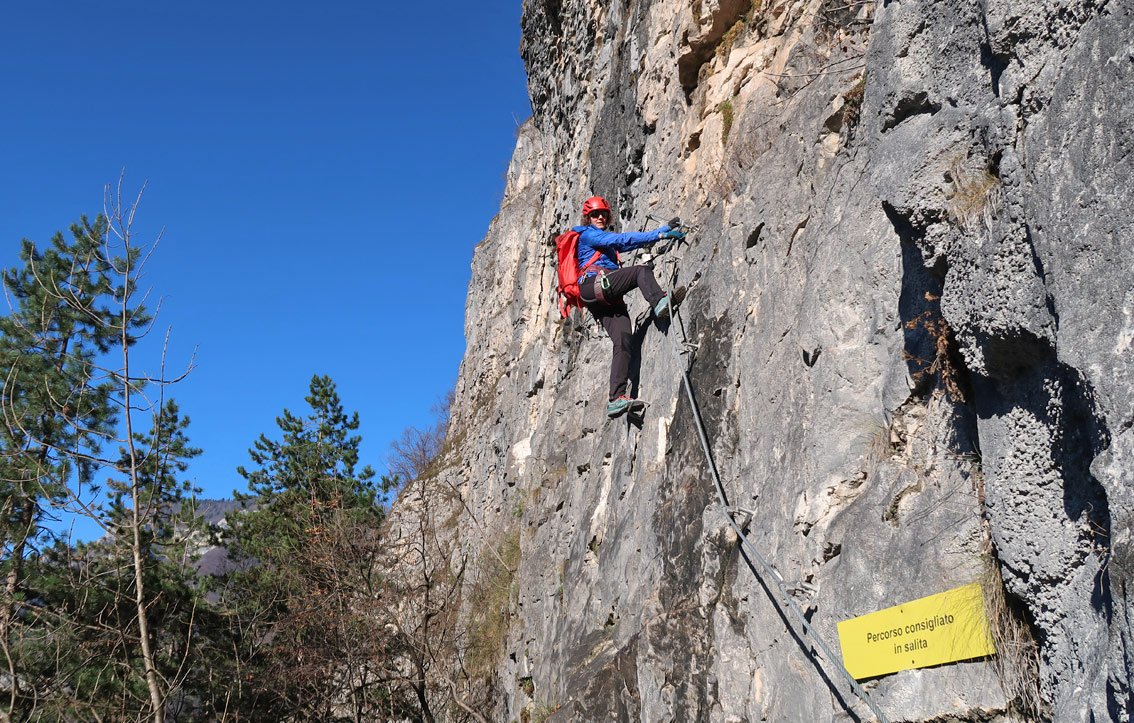 Siehe Topo. Unten hinauf (C und B), über die Ponte Tibetano und weiter nach oben (B/C), dann nach links (S6) und zur Scala Grazia absteigen. Über die 75 m lange Scala Grazia (A/B, kurz B) hinauf zum höchsten Punkt des Klettersteiges. Lust hat, steigt S1 ab. Den S4 zurück unter die Wand und am linken C-Klettersteig (C) hinauf (man kann sich davor noch das tolle Band (A/B) rechts vom Einstieg anschauen, geht aber auf diesem wieder zurück zum mittleren Klettersteig). Nach dem mittleren Klettersteig steigt man am Ende auf dem S9 und S1 wieder ab. Für Liebhaber extremer Schwierigkeiten gibt es im Mittelteil einen E-Klettersteig und links oben das sog. Tetto dell Salbai (E/F, evtl. F).
