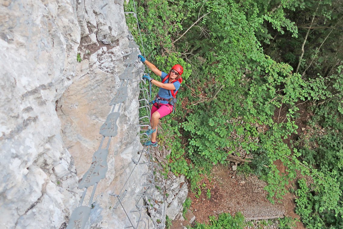Der Klettersteig ist zwar nur mit C/D bewertet, wegen der vielen C-Passagen eignet sich diese Ferrata aber NICHT für unerfahrene Einsteiger und Kinder! Dieser Klettersteig ist ein Ausdauer-Problem, oft geht Begehern noch vor der Seilleiter im Mittelteil die Kraft aus, diese bleiben dann hängen um zu rasten (man kommt an ihnen nicht einfach vorbei) - diesen Umstand sollte man bei großem Andrang berücksichtigen.