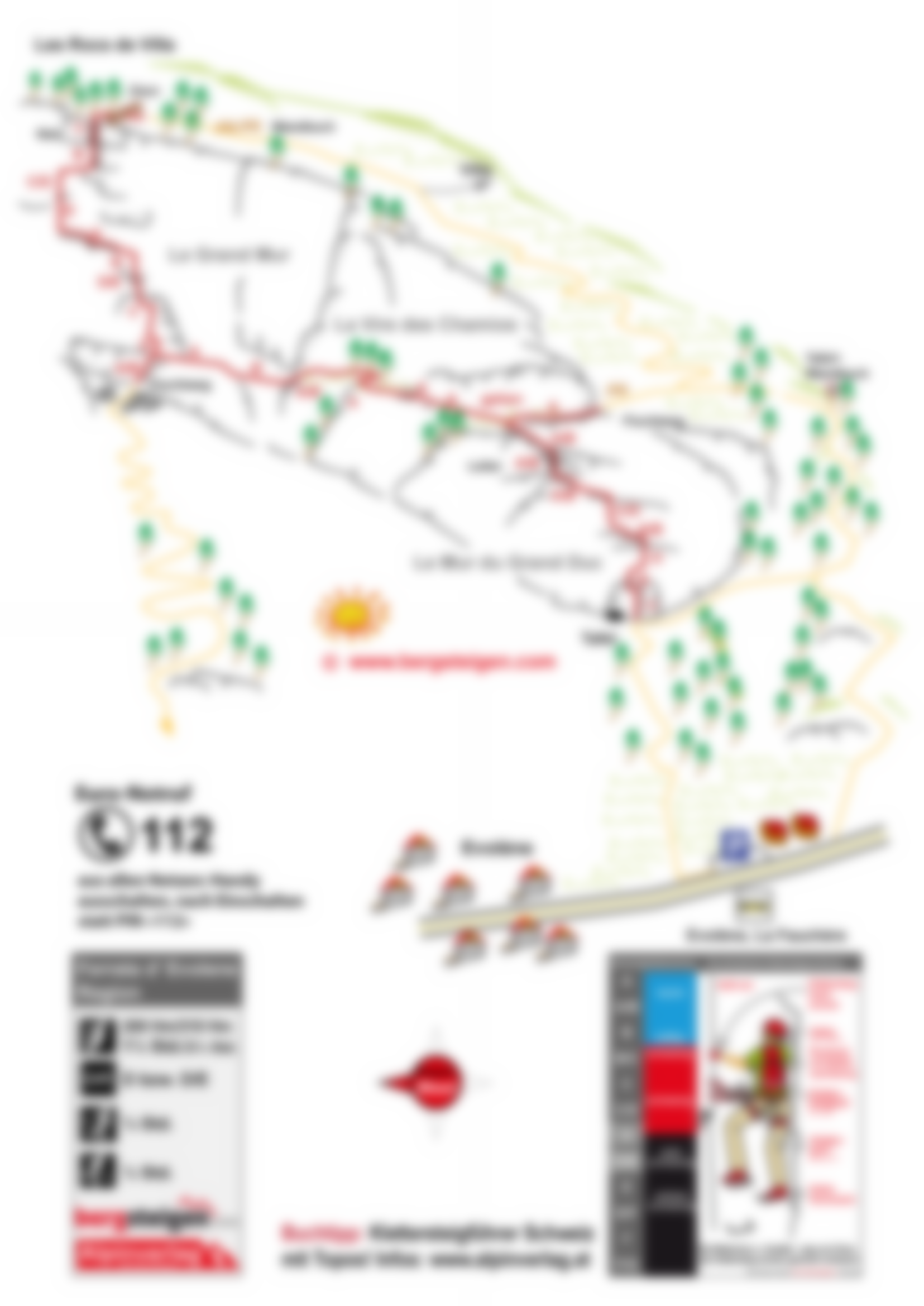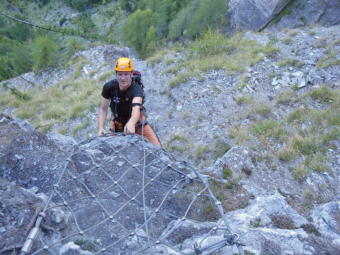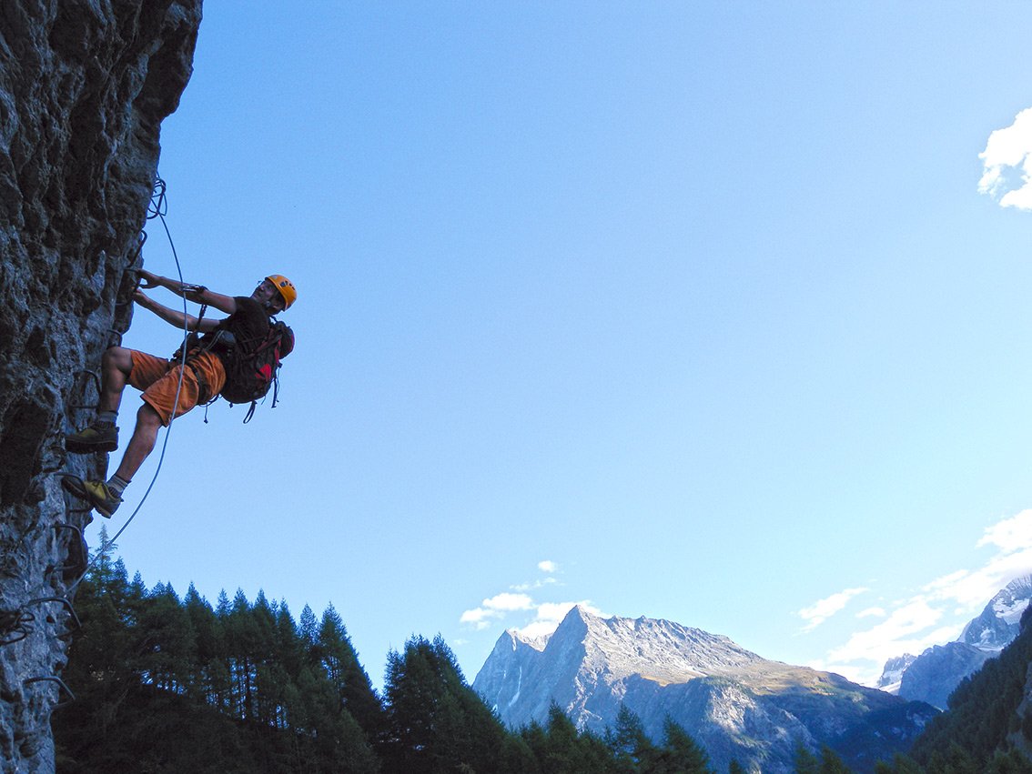 Die Region Evolène ist fl ächenmäßig die viertgrößte Gemeinde der Schweiz und eine Welt für sich mit majestätischen Bergen, riesigen Gletschern, schönen Wanderwegen und mittendrin eine talnahe, extreme Sportkletter-Ferrata. Gleich neben dem Ort unterhalb des mächtigen Eisriesen Dent Blanche (4357 m), an einer auf den ersten Blick aalglatten Wand, wurde die Ferrata angelegt. Die „Mur du Grand Duc“ - Uhuwand (D), das Gamsband (B) und die Große Mauer (D/E) können jeweils getrennt begangen werden. Wer die drei Teilabschnitte zusammenhängt, kommt auf ein 450 Meter langes Klettersteigvergnügen, das lediglich im fl achen Mittelteil den Bizeps schont. Hat man die Strapazen hinter sich gebracht, kann man von einer schönen Bergwiese die imposante Aussicht auf die 4000er im Süden genießen.