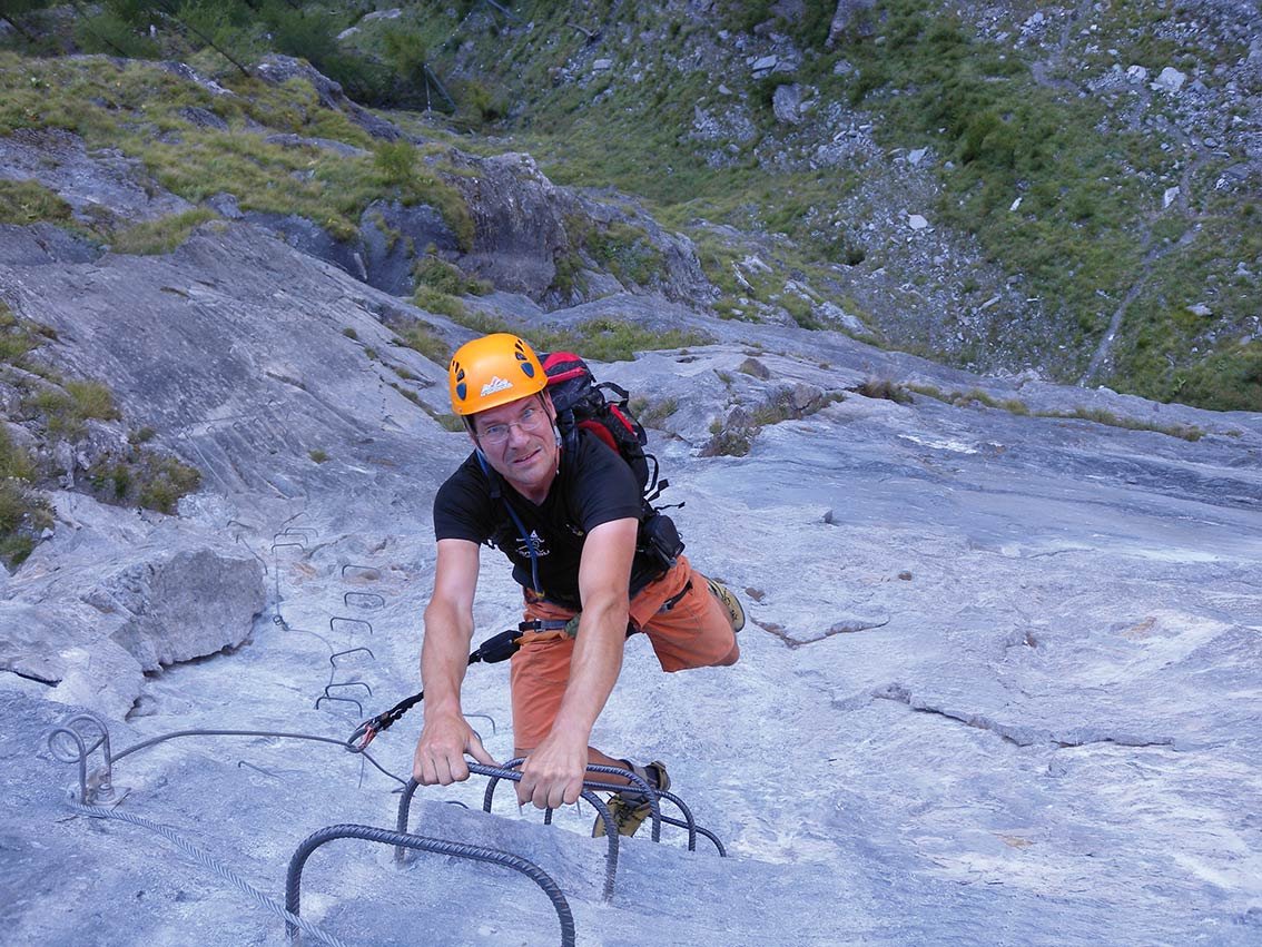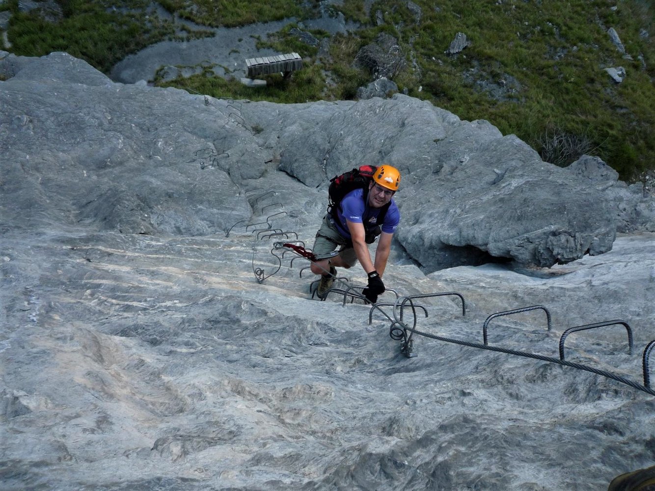 Klettersteigausrüstung und Helm; für Schwächere ein Sicherungsseil.