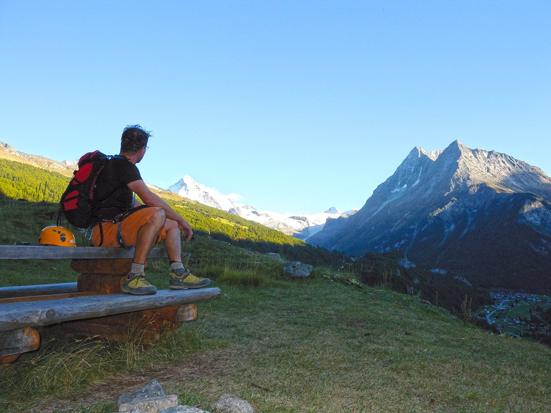 Vom Parkplatz ein paar Meter auf der Straße zurück nach Evolène, dann rechts auf der Wiese zum Waldrand und dem beschilderten Weg steil hinauf zum Einstieg folgen.