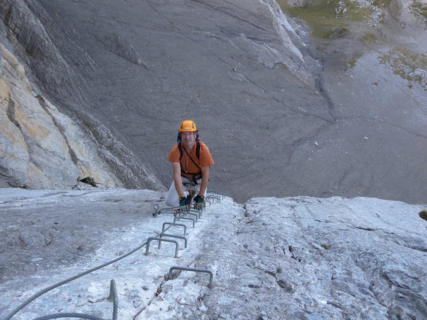 Der Steig ist französisch weit gesichert und hat viele steile Vertikalpassagen. Es gibt einen Notausstieg.