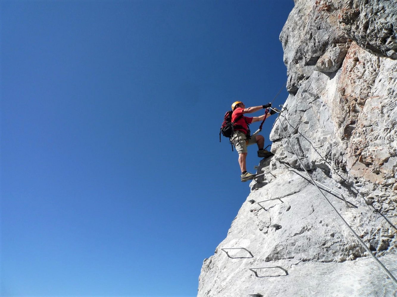 Komplette Klettersteigausrüstung, Helm und Klettersteighandschuhe.